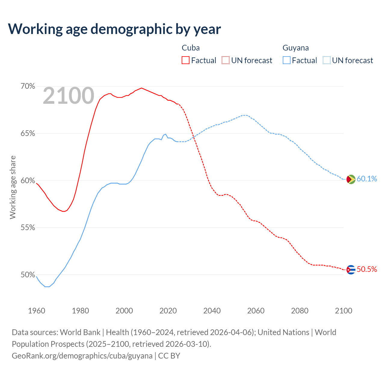 - Cuba has 7.42M working age adults (aged 15-64) vs 540K in Guyana.