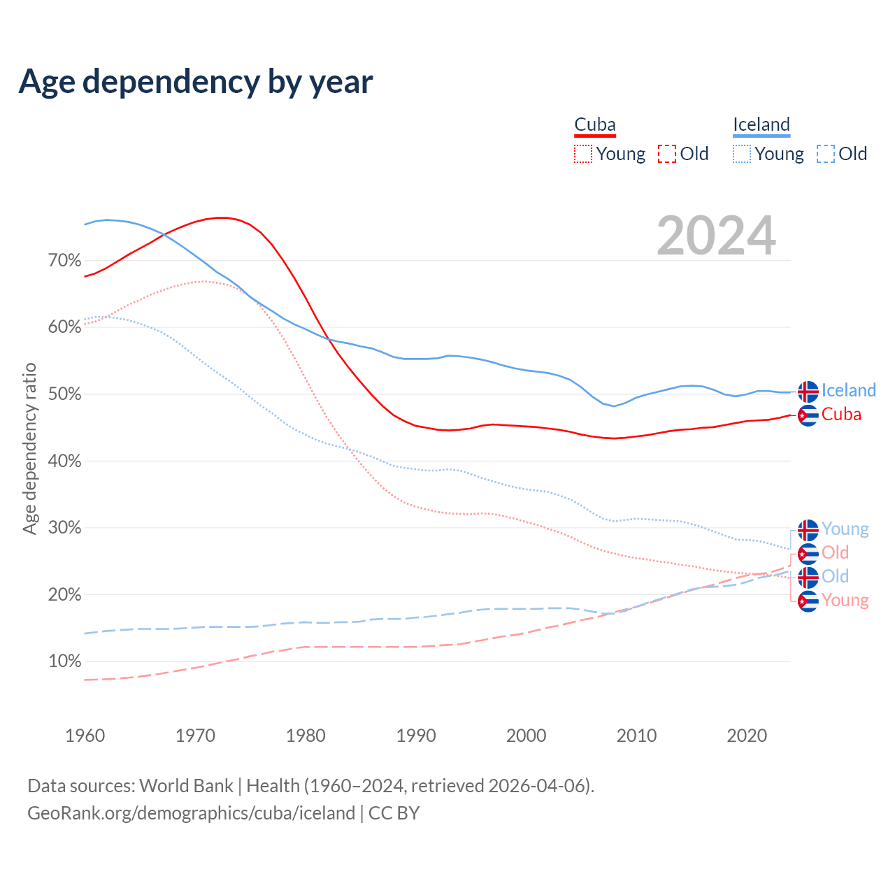- Cuba is ranked 27/196 by median age (oldest to youngest) vs 65/196 for Iceland.