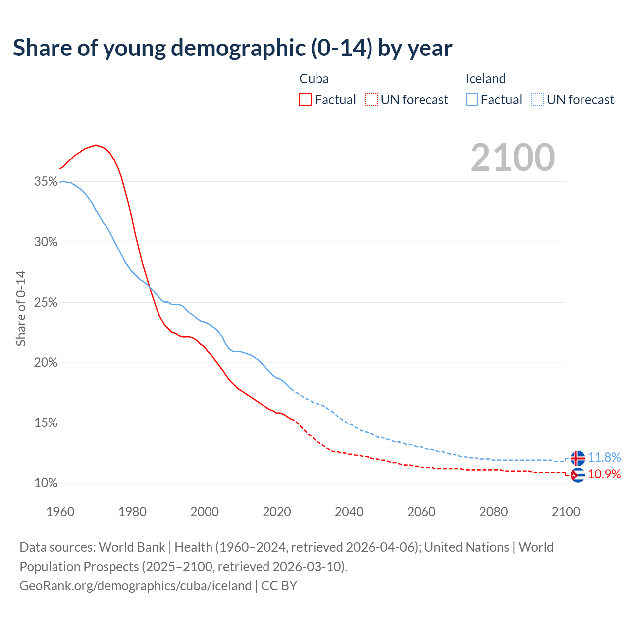 - The share of young demographic (0-15 years old) in Cuba is 15.3% vs 17.8% in Iceland.