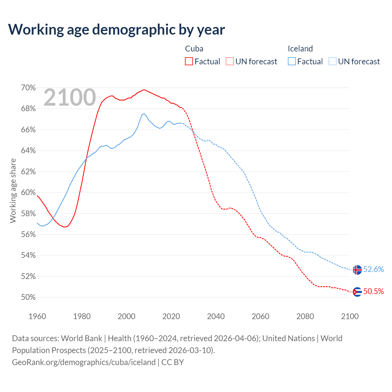 - The share of old-age demographic (65+) in Cuba is 16.6% vs 15.6% in Iceland.
