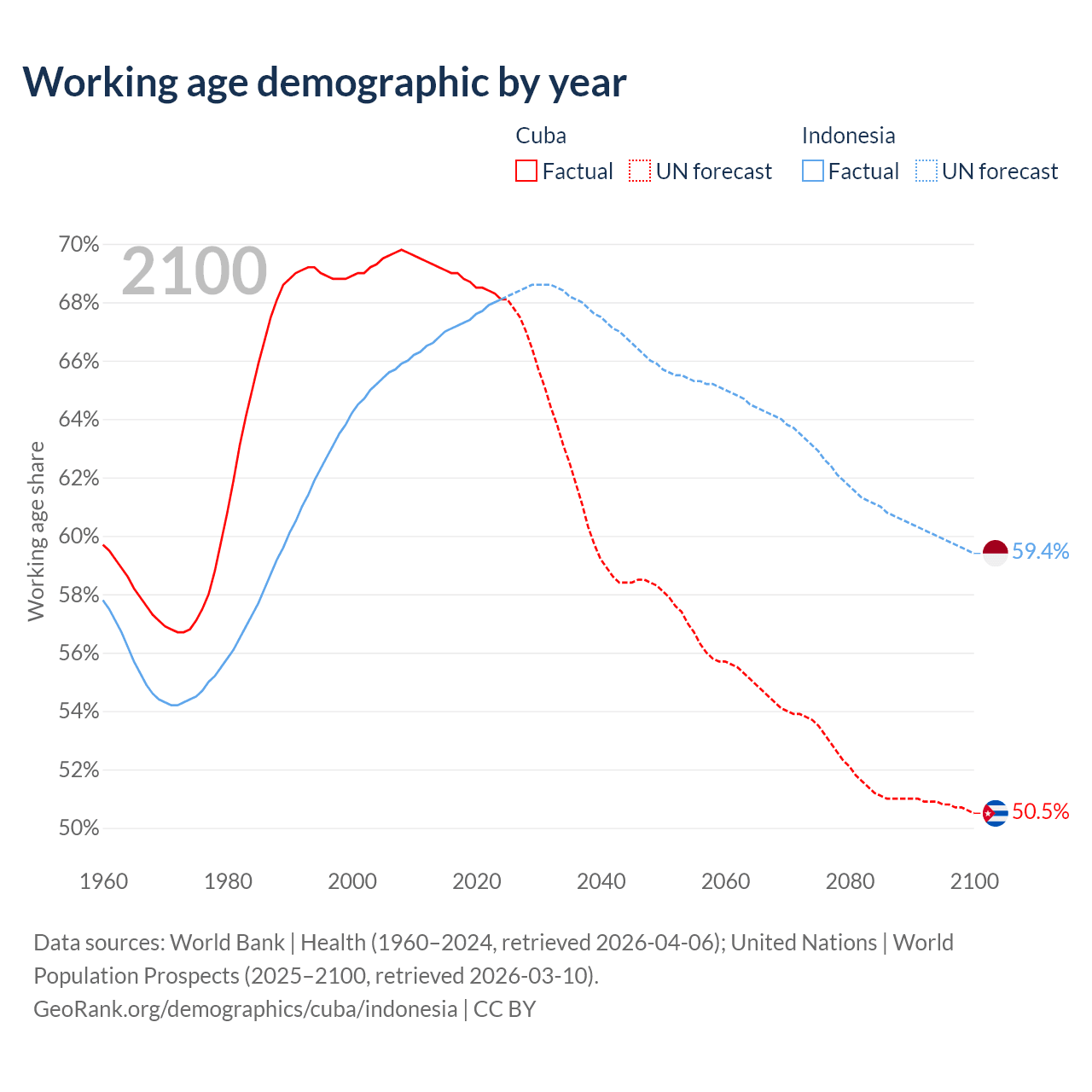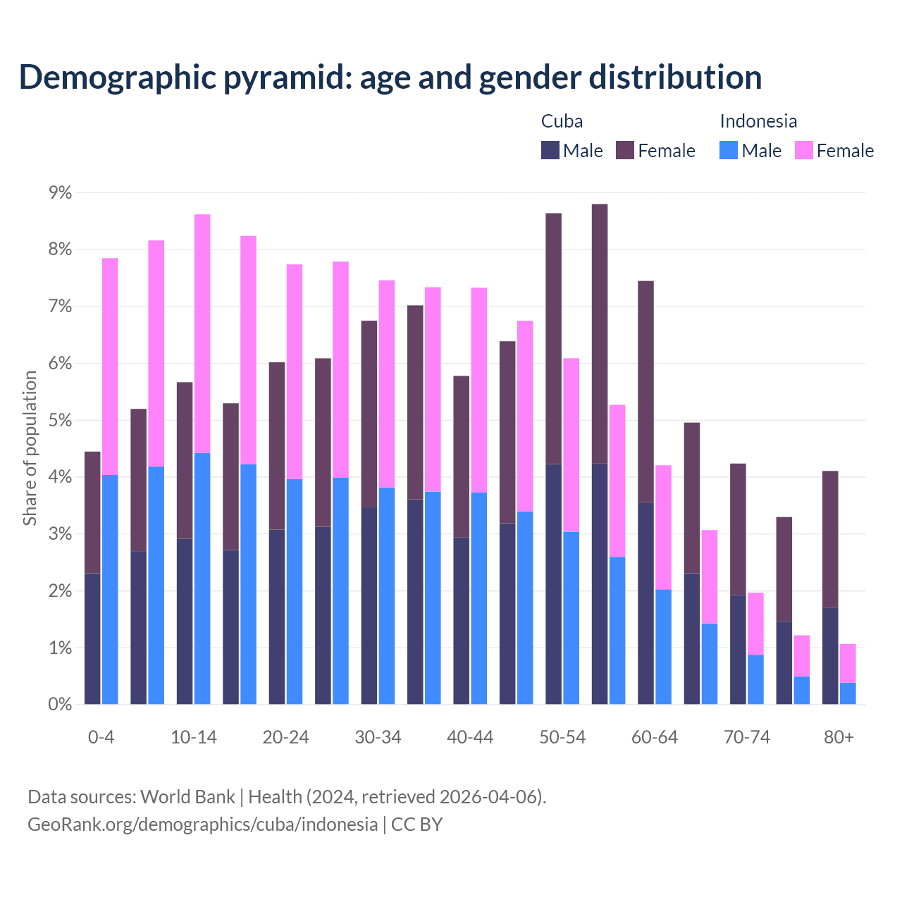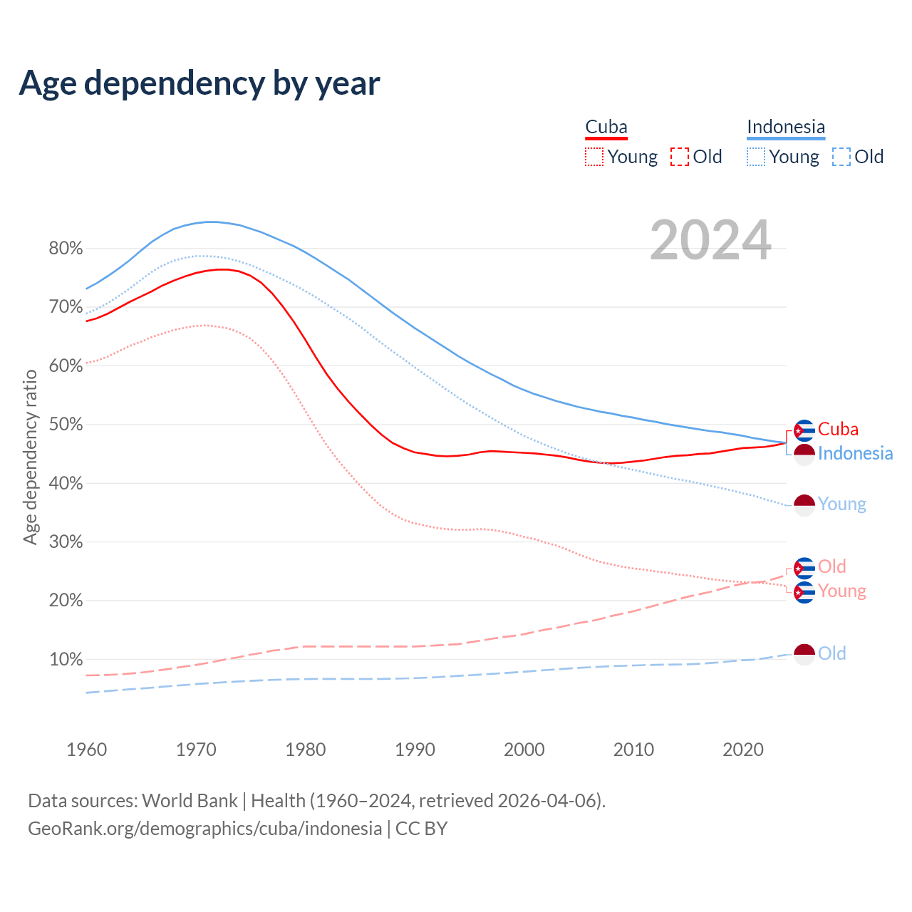 - Cuba is ranked 27/196 by median age (oldest to youngest) vs 93/196 for Indonesia.