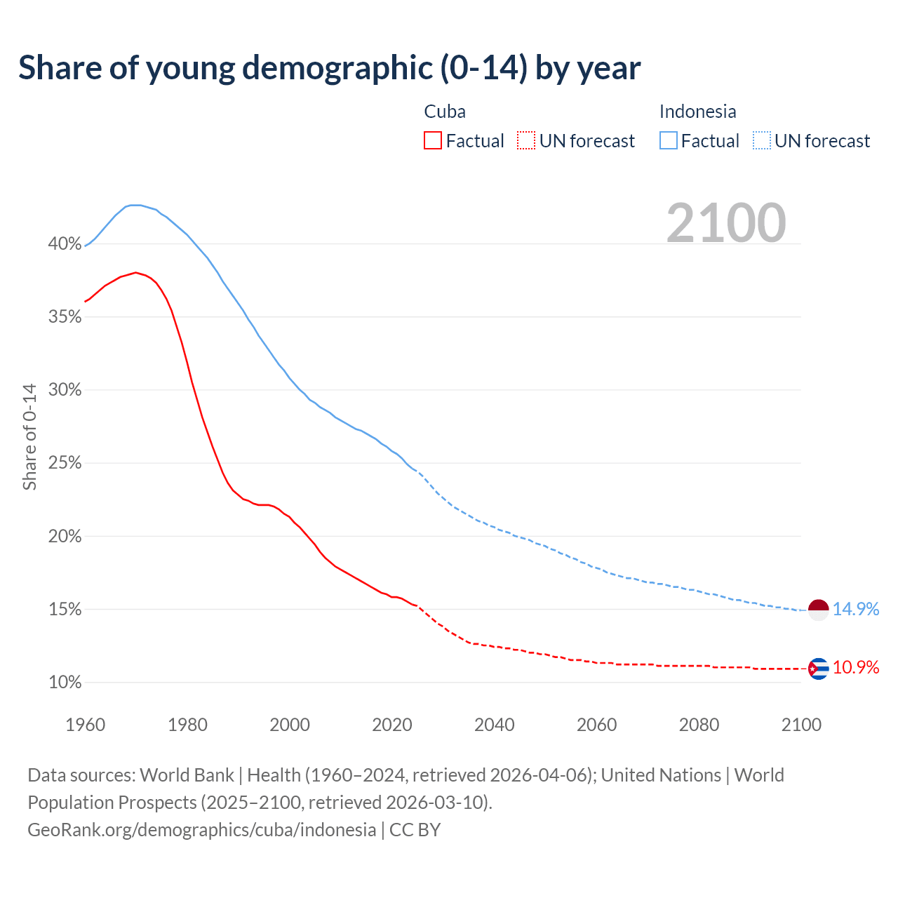 - The share of young demographic (0-15 years old) in Cuba is 15.3% vs 24.6% in Indonesia.
