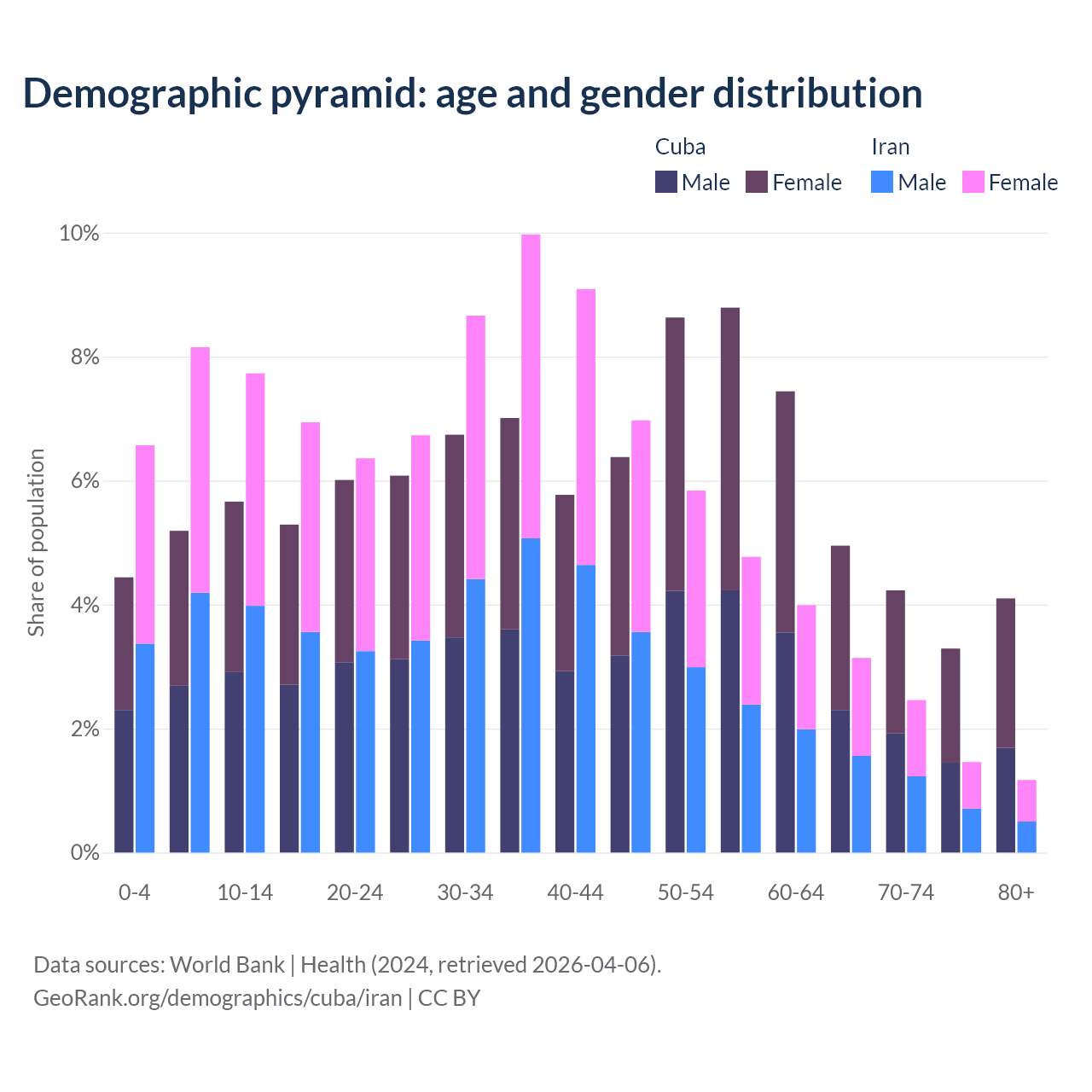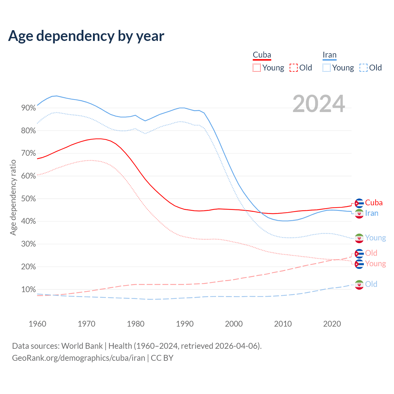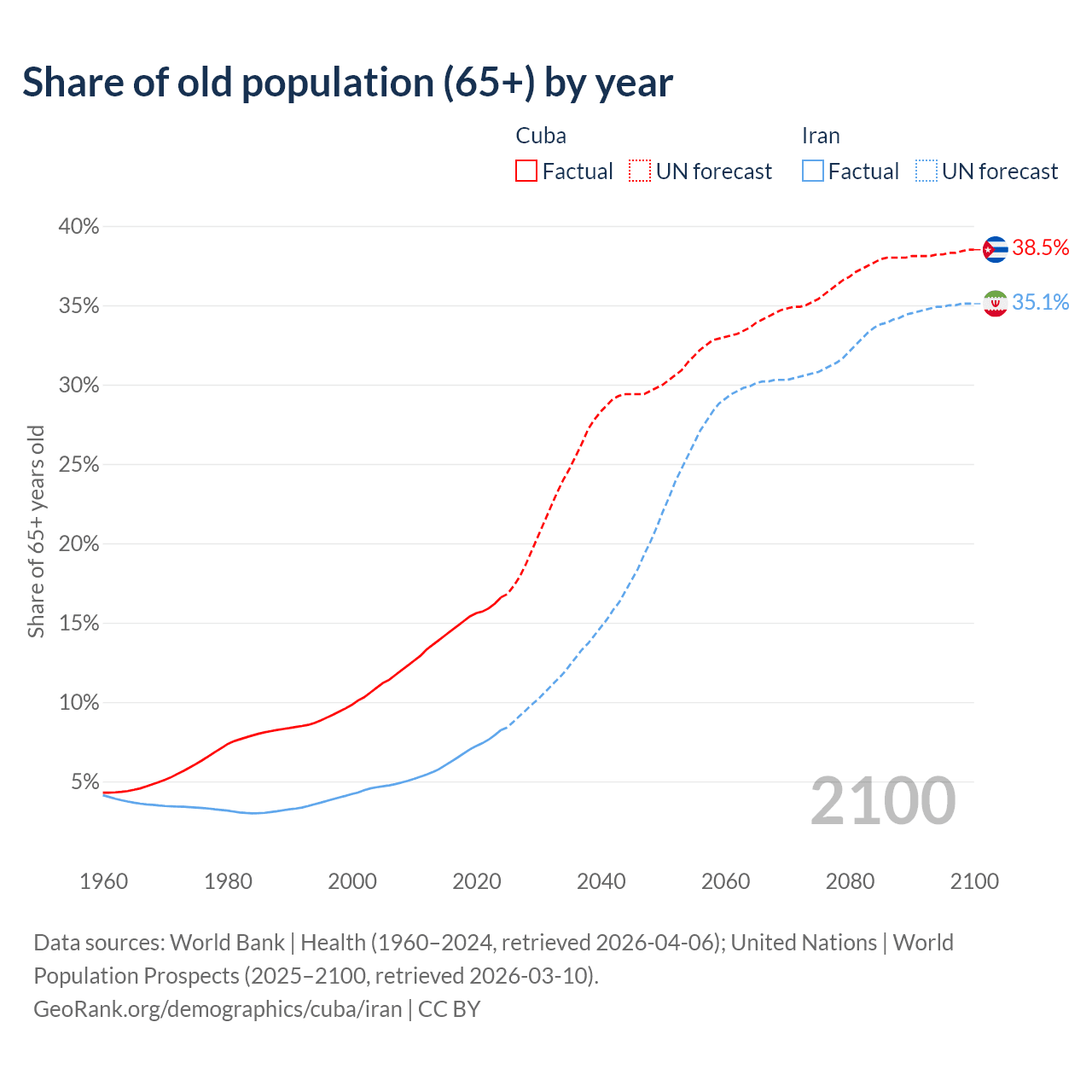 - The share of old-age demographic (65+) in Cuba is 16.6% vs 8.24% in Iran.