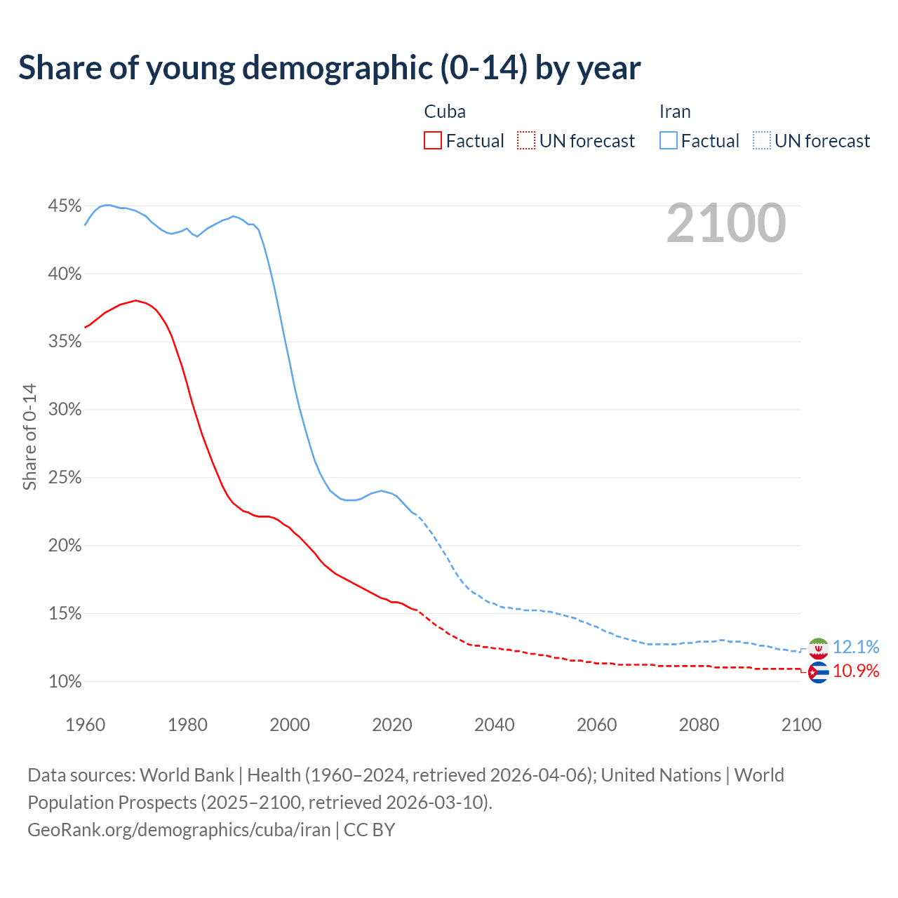 - The share of young demographic (0-15 years old) in Cuba is 15.3% vs 22.4% in Iran.