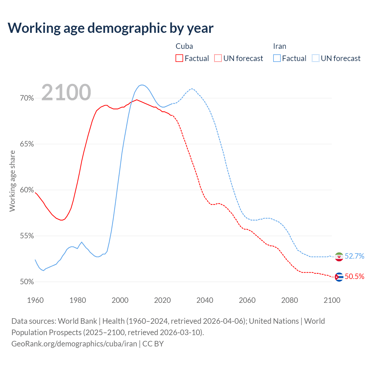- Cuba has 7.42M working age adults (aged 15-64) vs 64.8M in Iran.