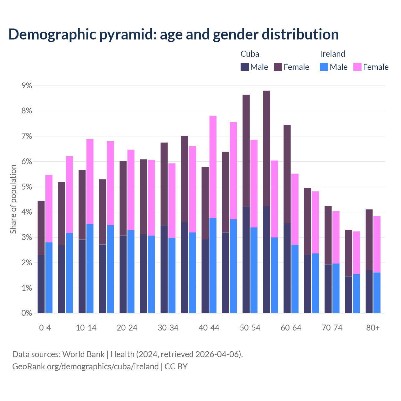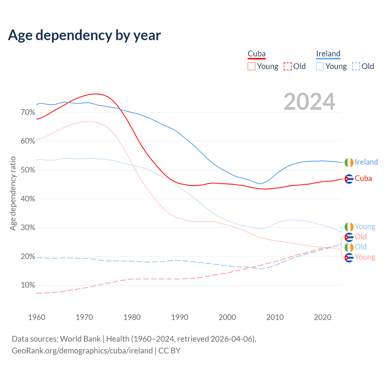 - Cuba is ranked 27/196 by median age (oldest to youngest) vs 48/196 for Ireland.