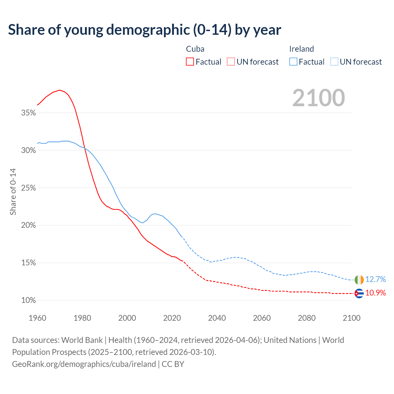 - The share of young demographic (0-15 years old) in Cuba is 15.3% vs 18.6% in Ireland.