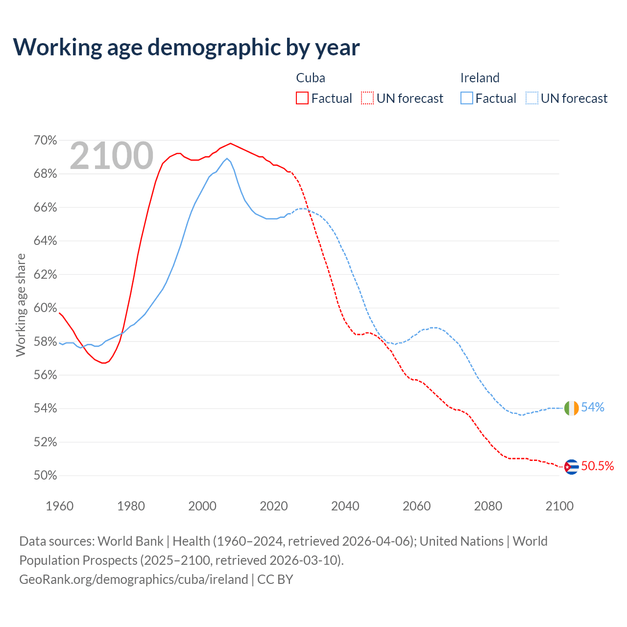 - Cuba has 7.42M working age adults (aged 15-64) vs 3.62M in Ireland.