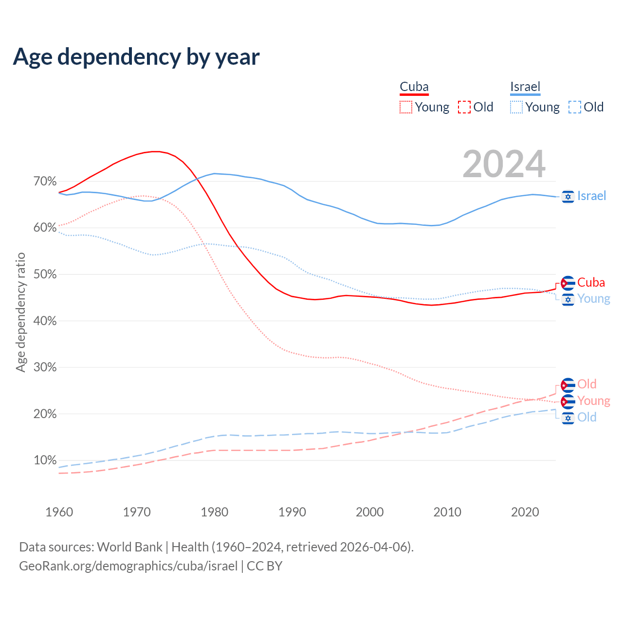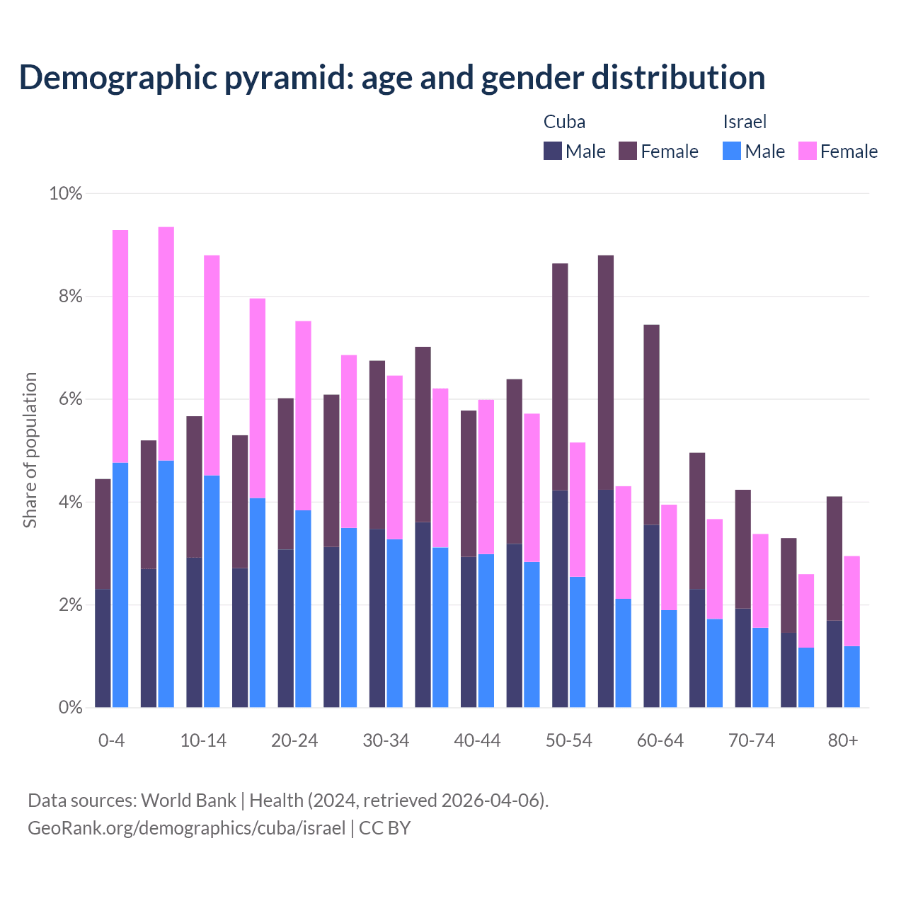- Cuba is ranked 27/196 by median age (oldest to youngest) vs 103/196 for Israel.