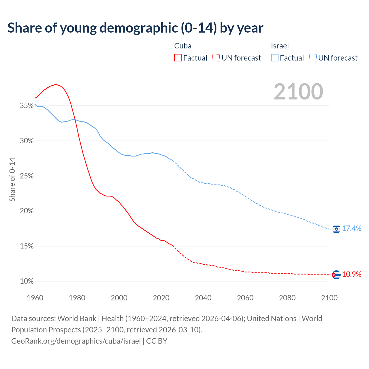 - The share of young demographic (0-15 years old) in Cuba is 15.3% vs 27.4% in Israel.