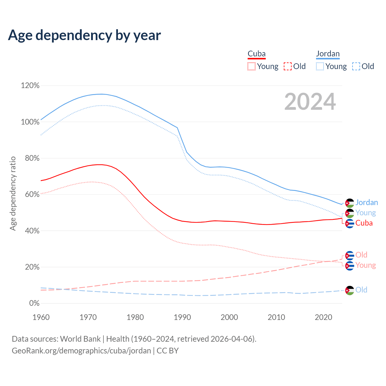 - The share of old-age demographic (65+) in Cuba is 16.6% vs 4.52% in Jordan.