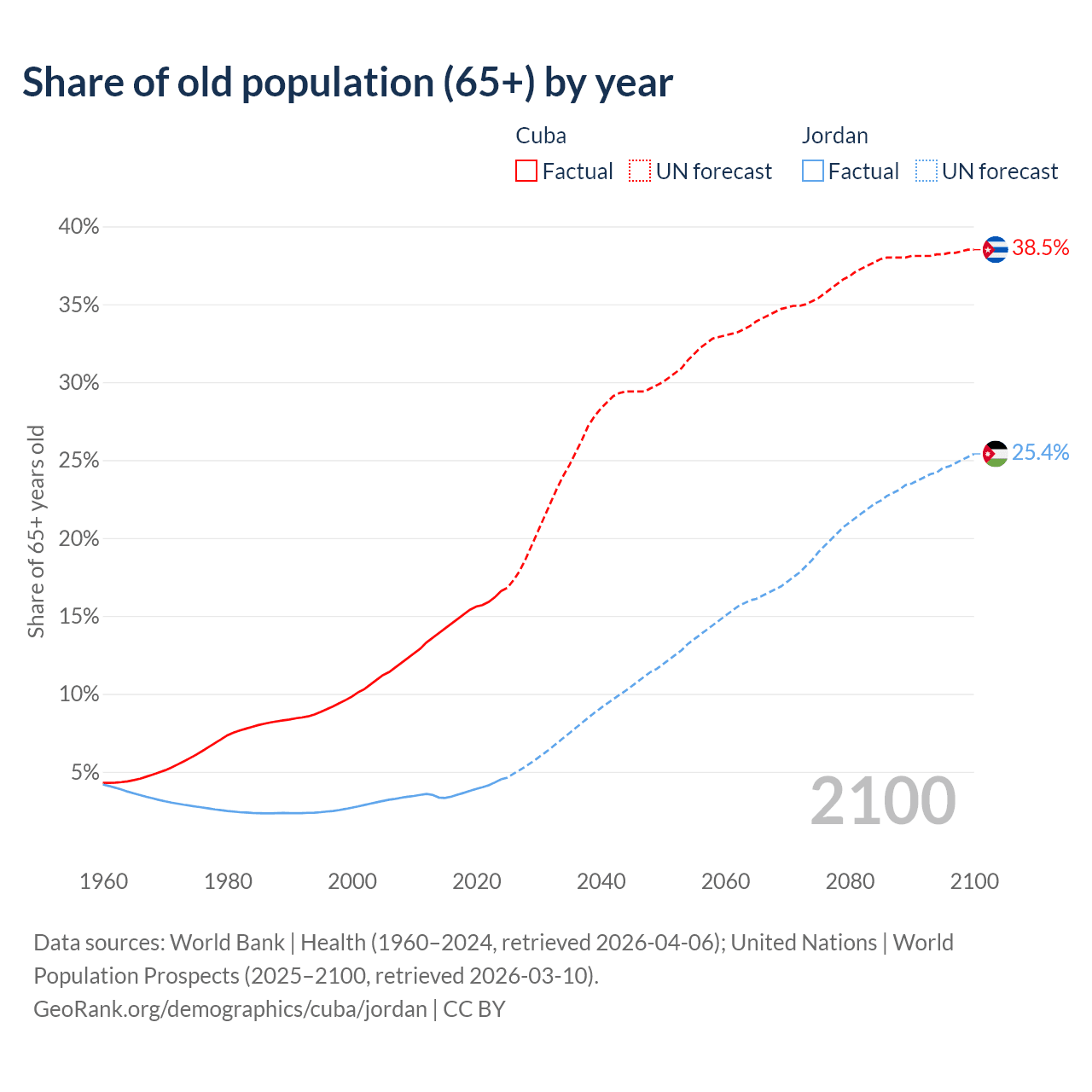 The share of older people aged 65 and over is 16.6% in Cuba and 4.52% in Jordan. Life expectancy in Cuba compared to Jordan .