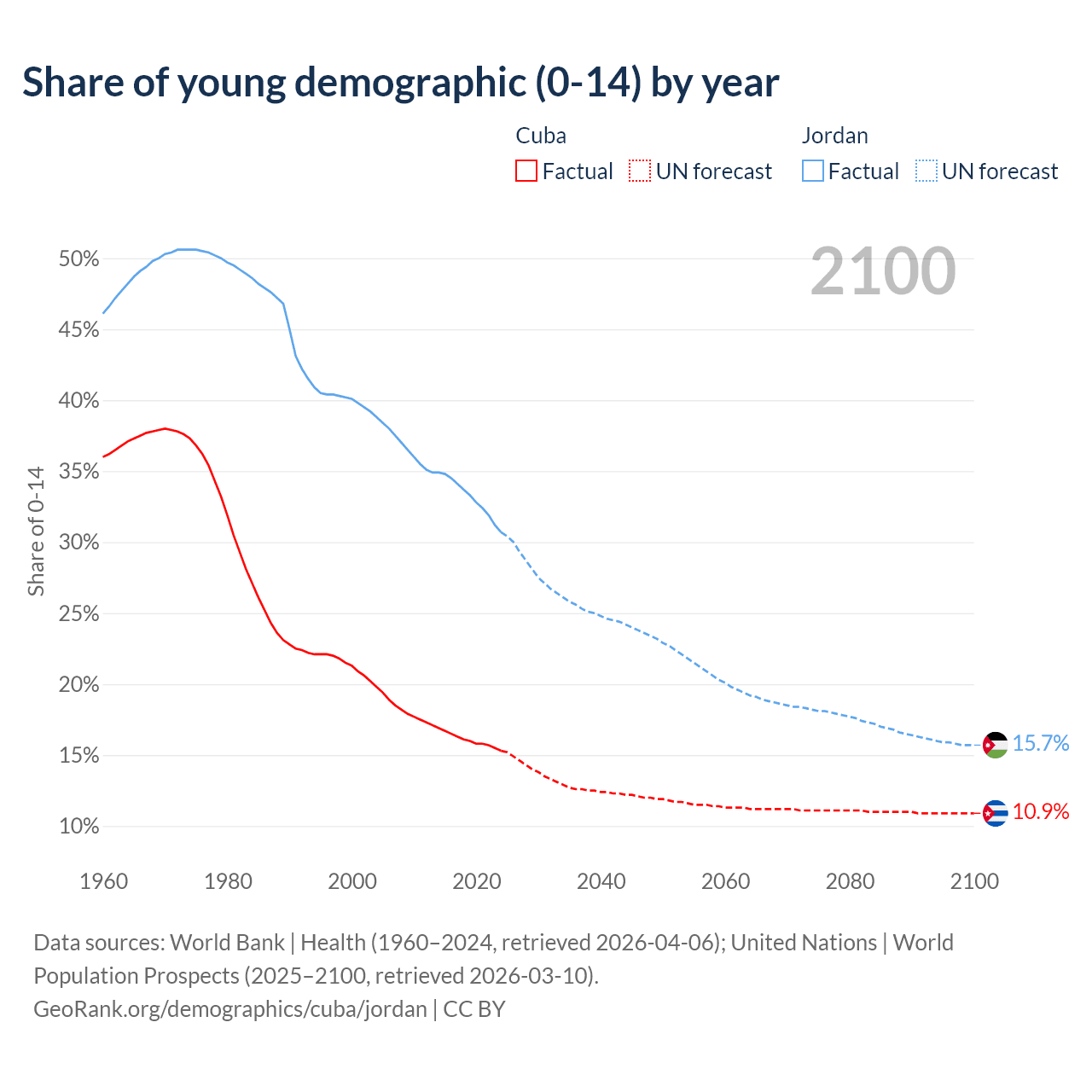 - The share of young demographic (0-15 years old) in Cuba is 15.3% vs 30.7% in Jordan.