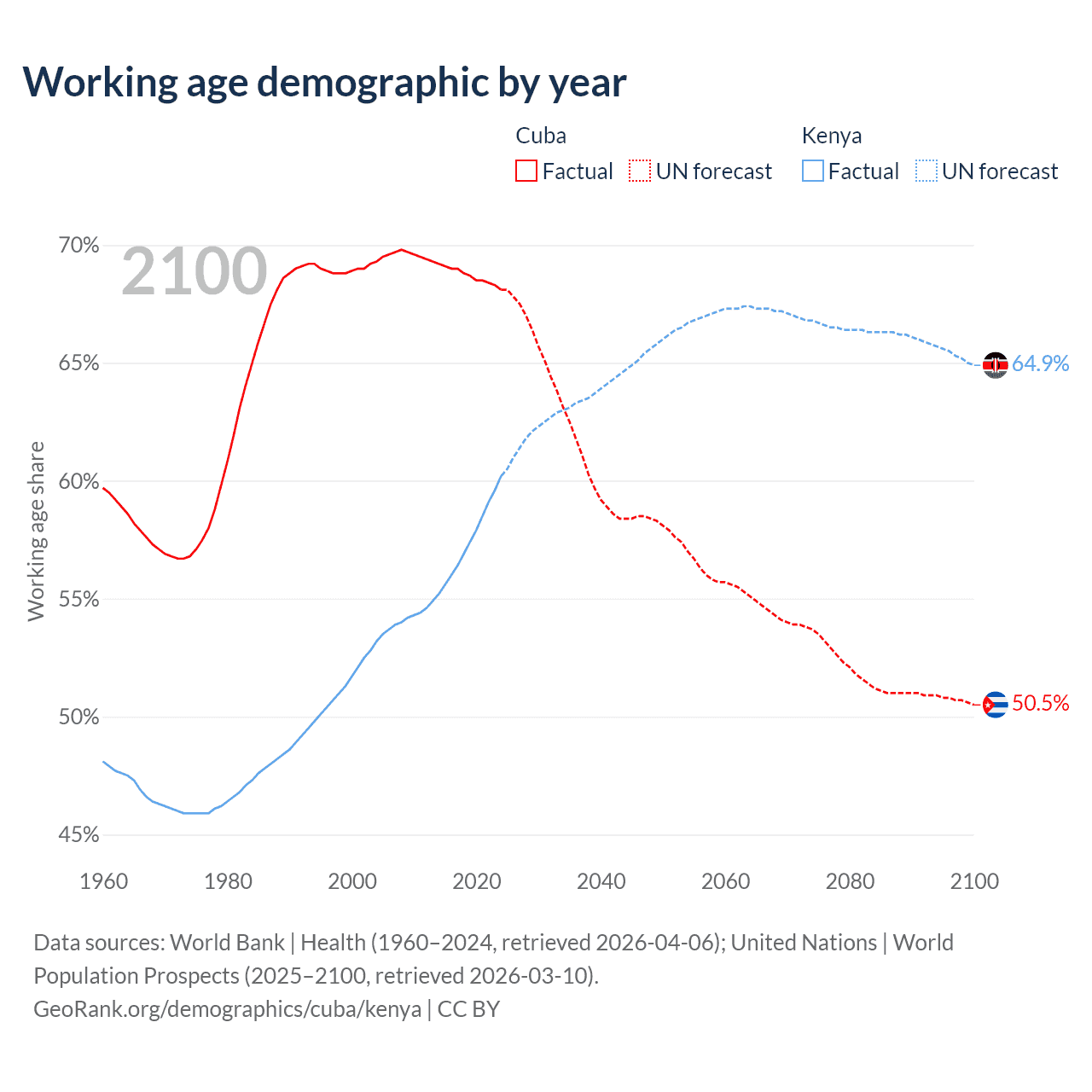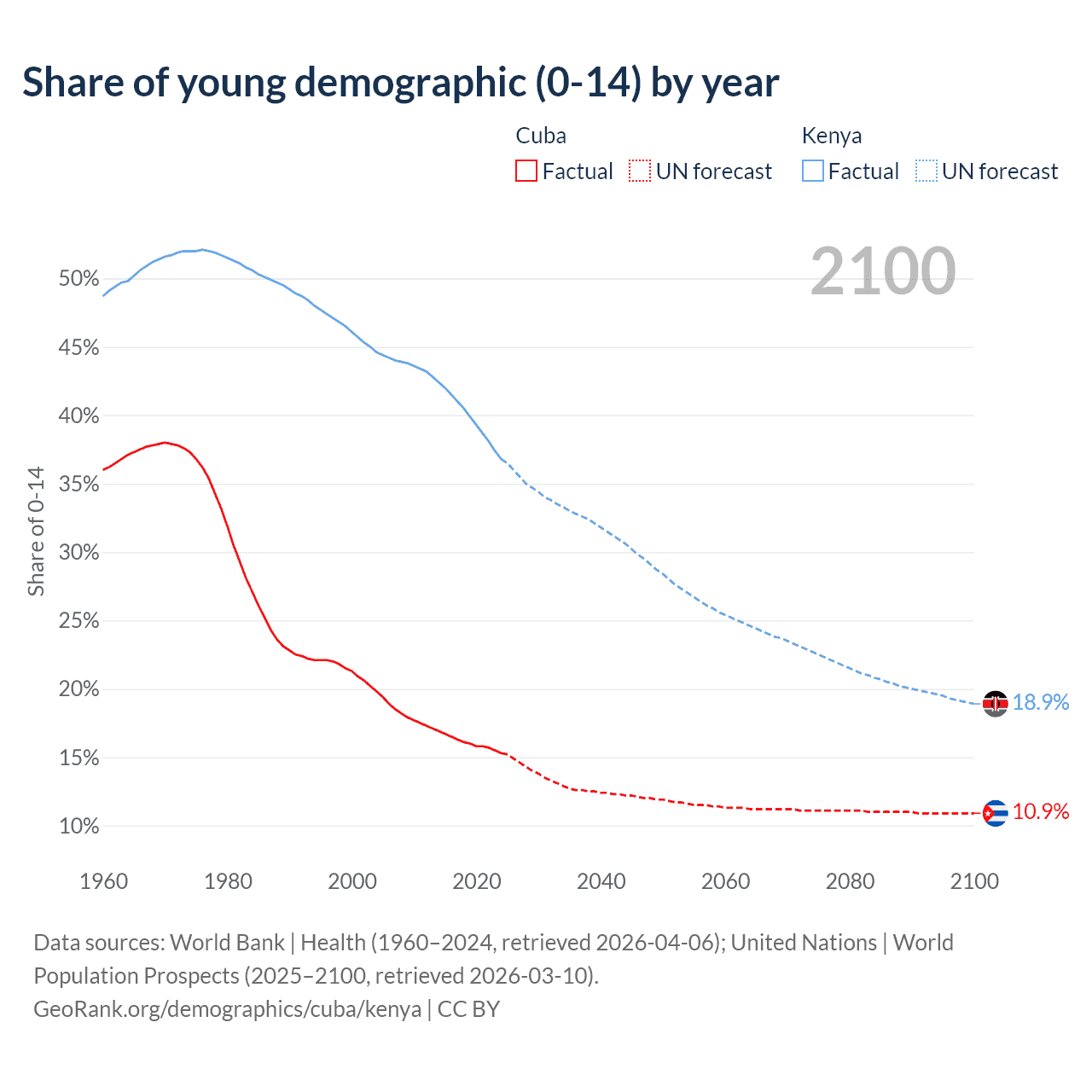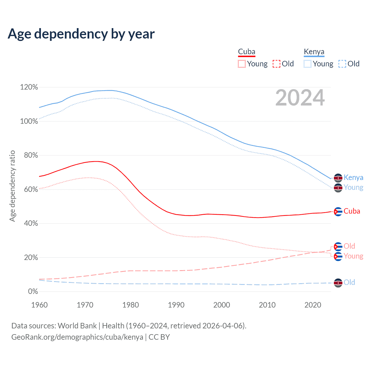 - The share of old-age demographic (65+) in Cuba is 16.6% vs 2.97% in Kenya.