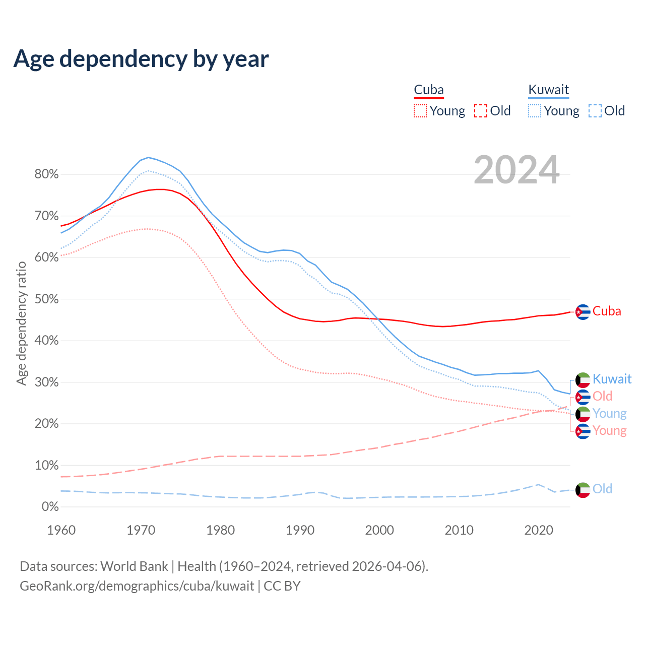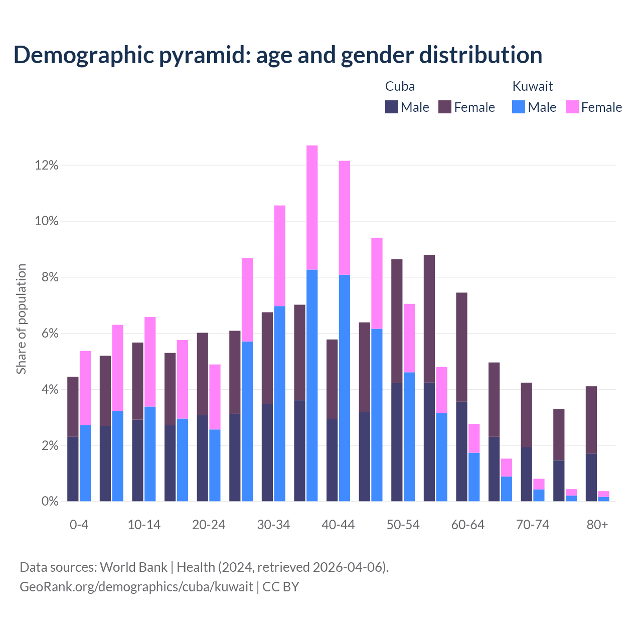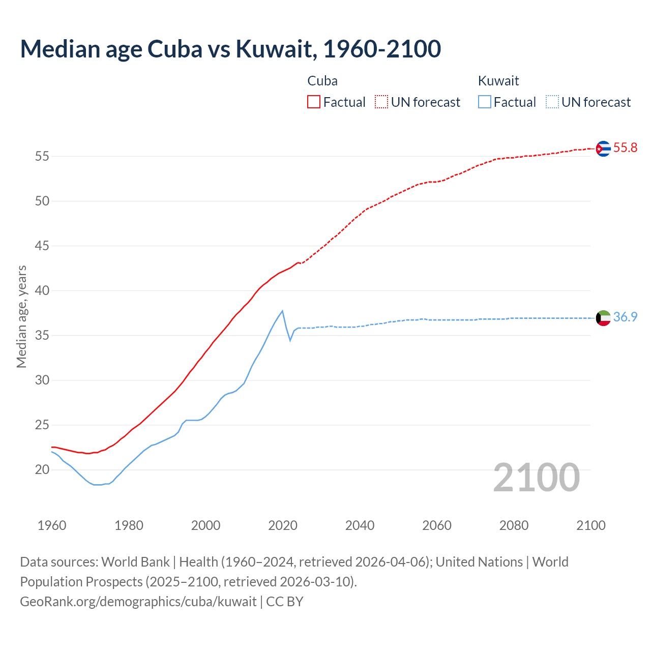 - Cuba is ranked 27/196 by median age (oldest to youngest) vs 71/196 for Kuwait.