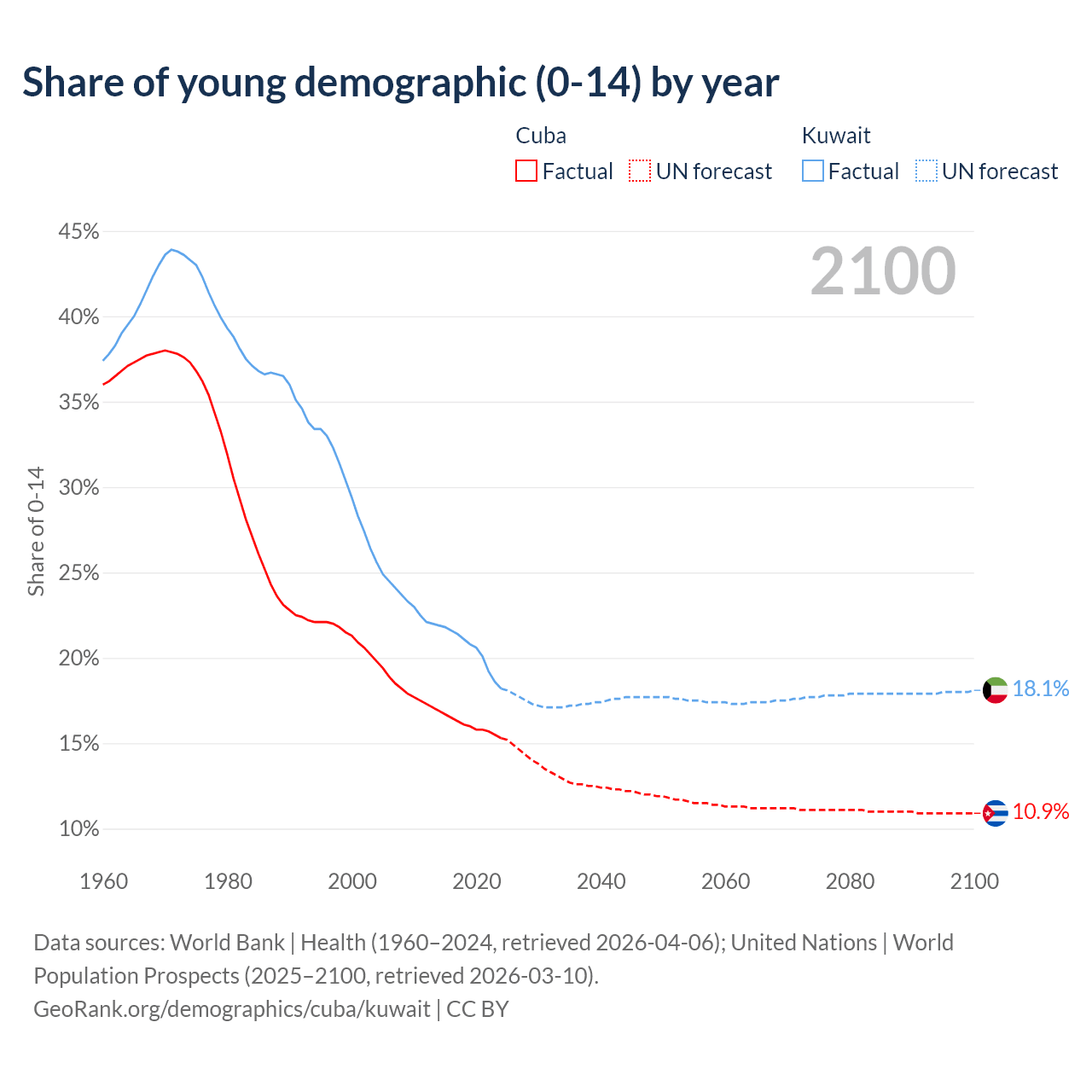 - The share of young demographic (0-15 years old) in Cuba is 15.3% vs 18.2% in Kuwait.