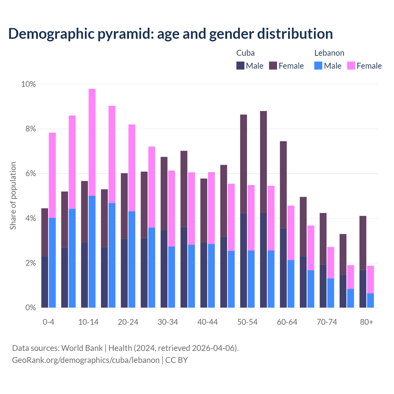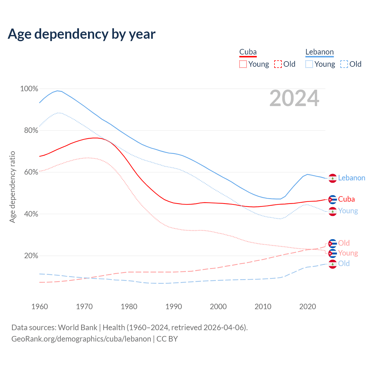 - Cuba is ranked 27/196 by median age (oldest to youngest) vs 106/196 for Lebanon.