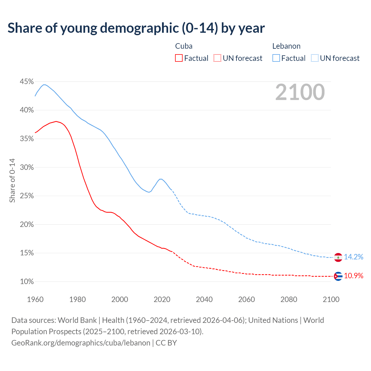 - The share of young demographic (0-15 years old) in Cuba is 15.3% vs 26.2% in Lebanon.