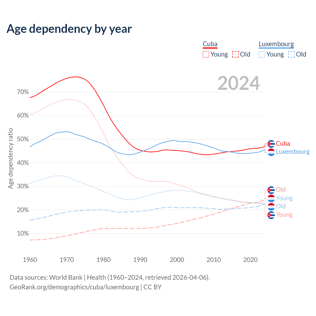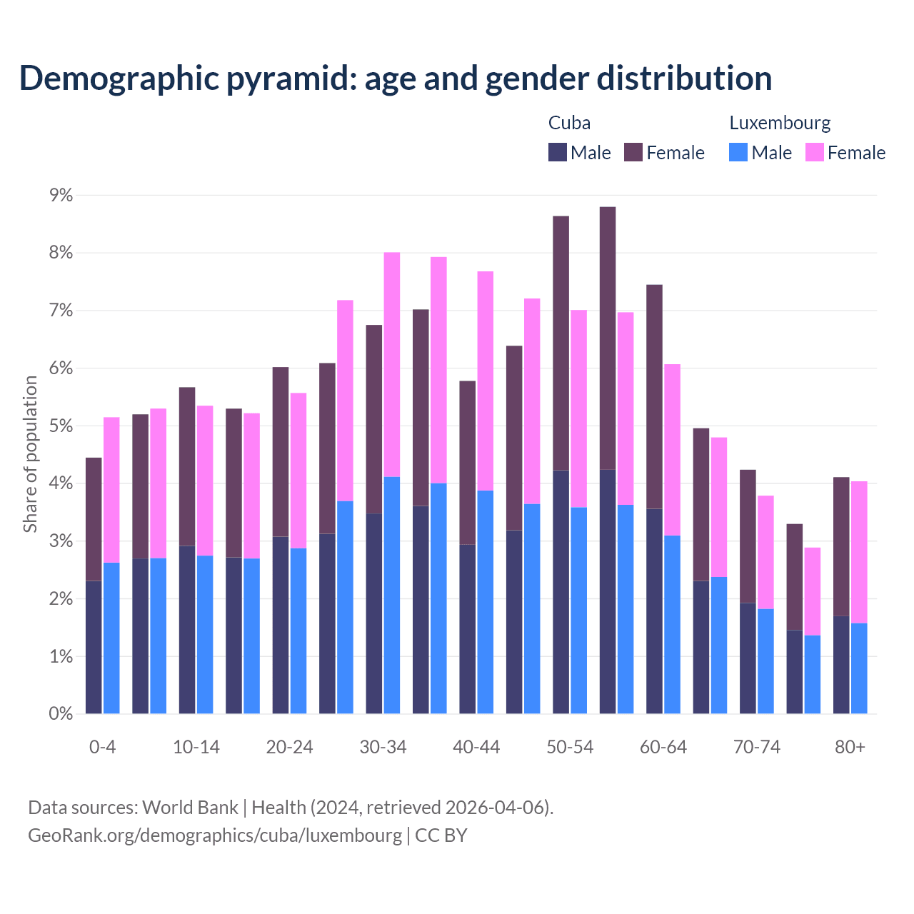 - The share of old-age demographic (65+) in Cuba is 16.6% vs 15.5% in Luxembourg.
