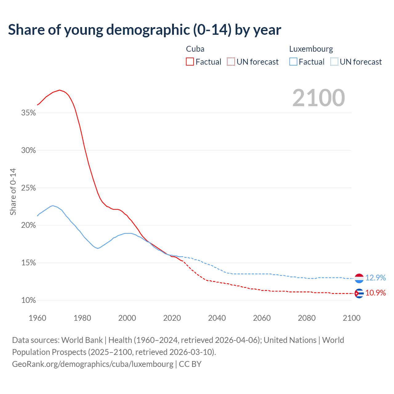 - The share of young demographic (0-15 years old) in Cuba is 15.3% vs 15.8% in Luxembourg.