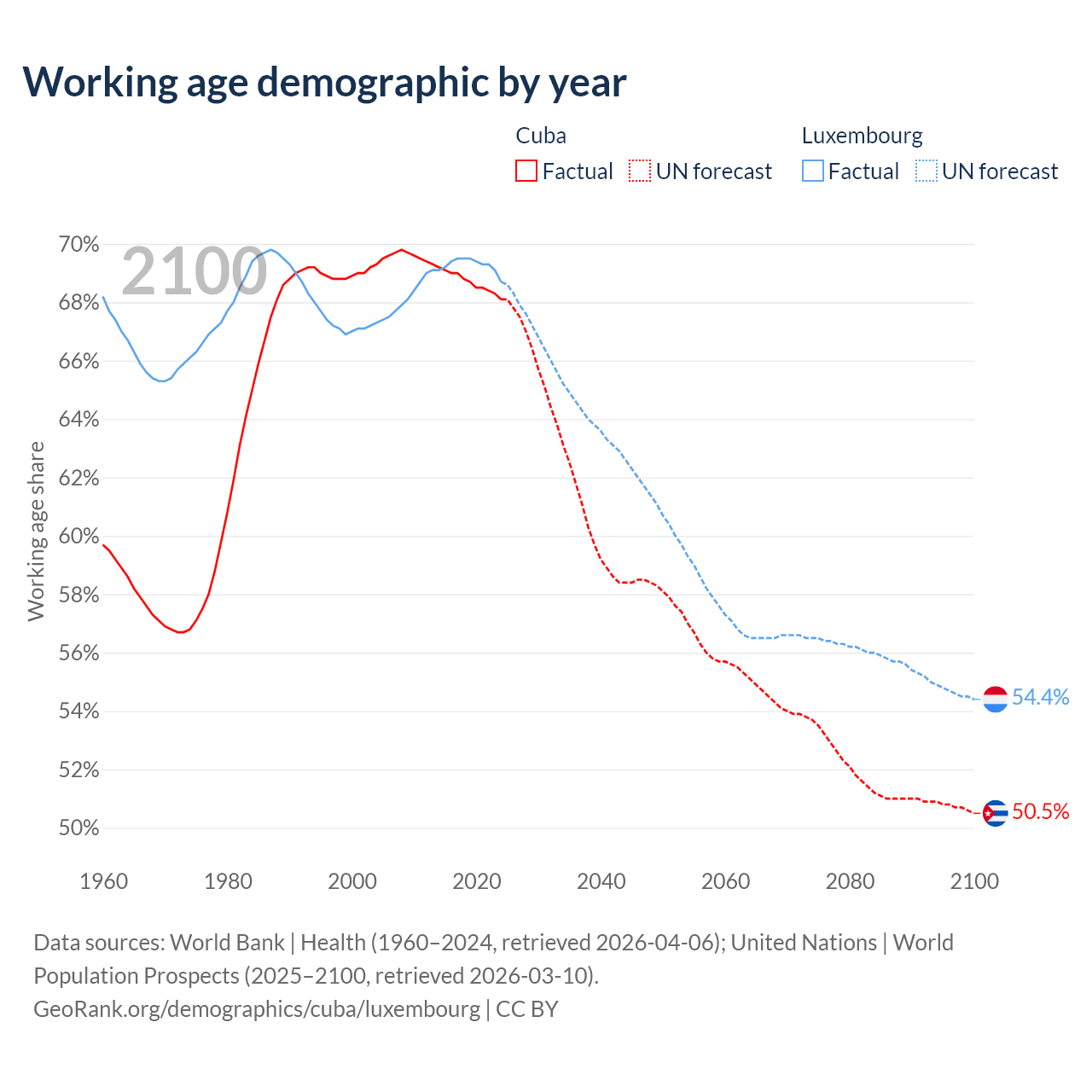 Median age Cuba vs Luxembourg, 1960-2100