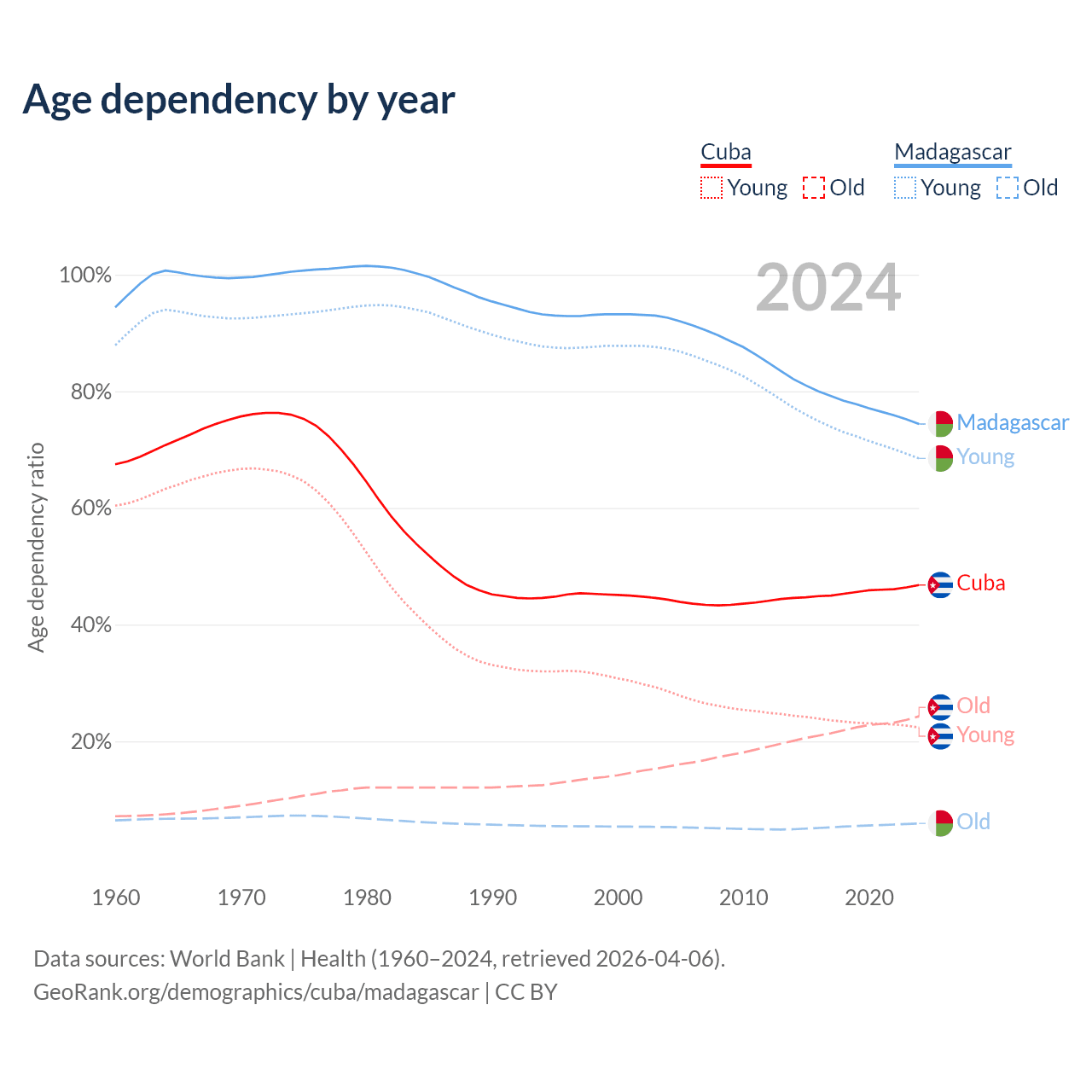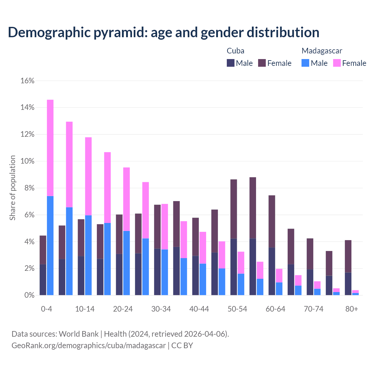 - Cuba is ranked 27/196 by median age (oldest to youngest) vs 165/196 for Madagascar.