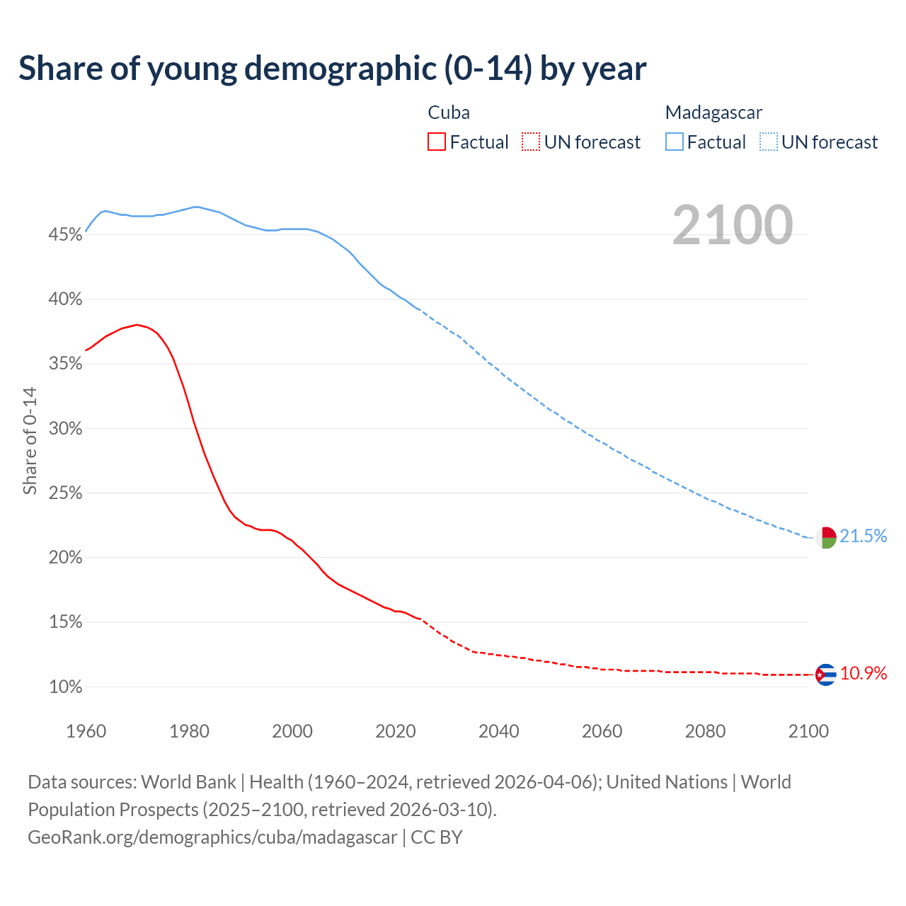 - The share of young demographic (0-15 years old) in Cuba is 15.3% vs 39.3% in Madagascar.