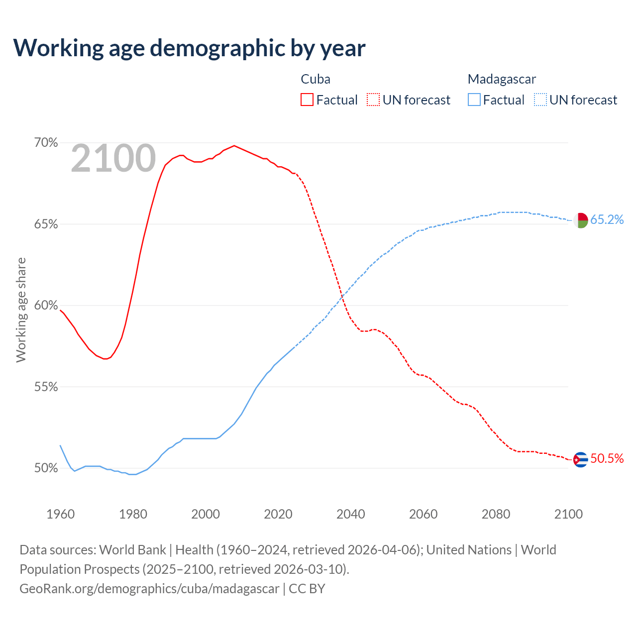 - Cuba has 7.42M working age adults (aged 15-64) vs 19.4M in Madagascar.