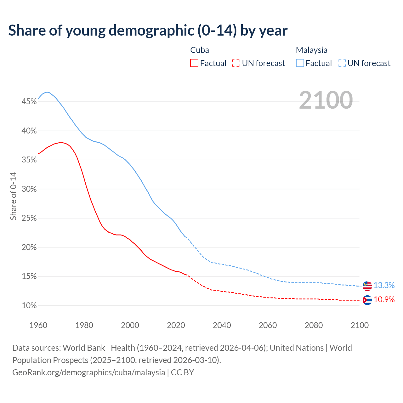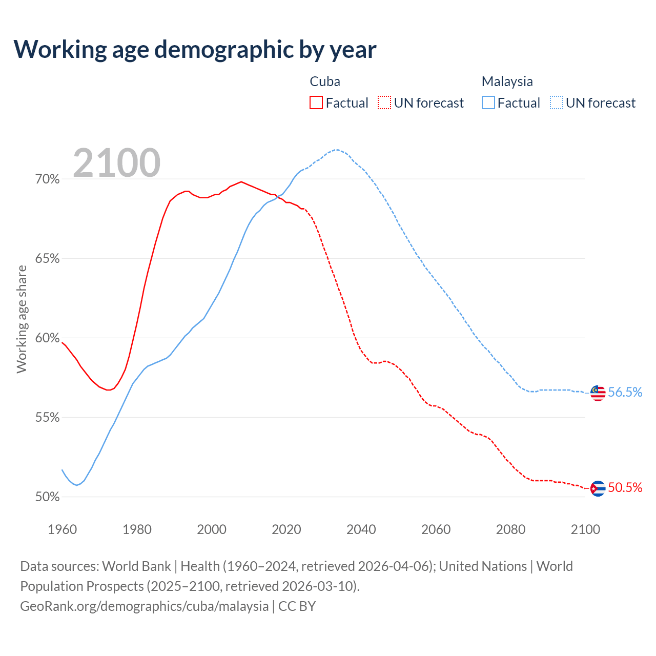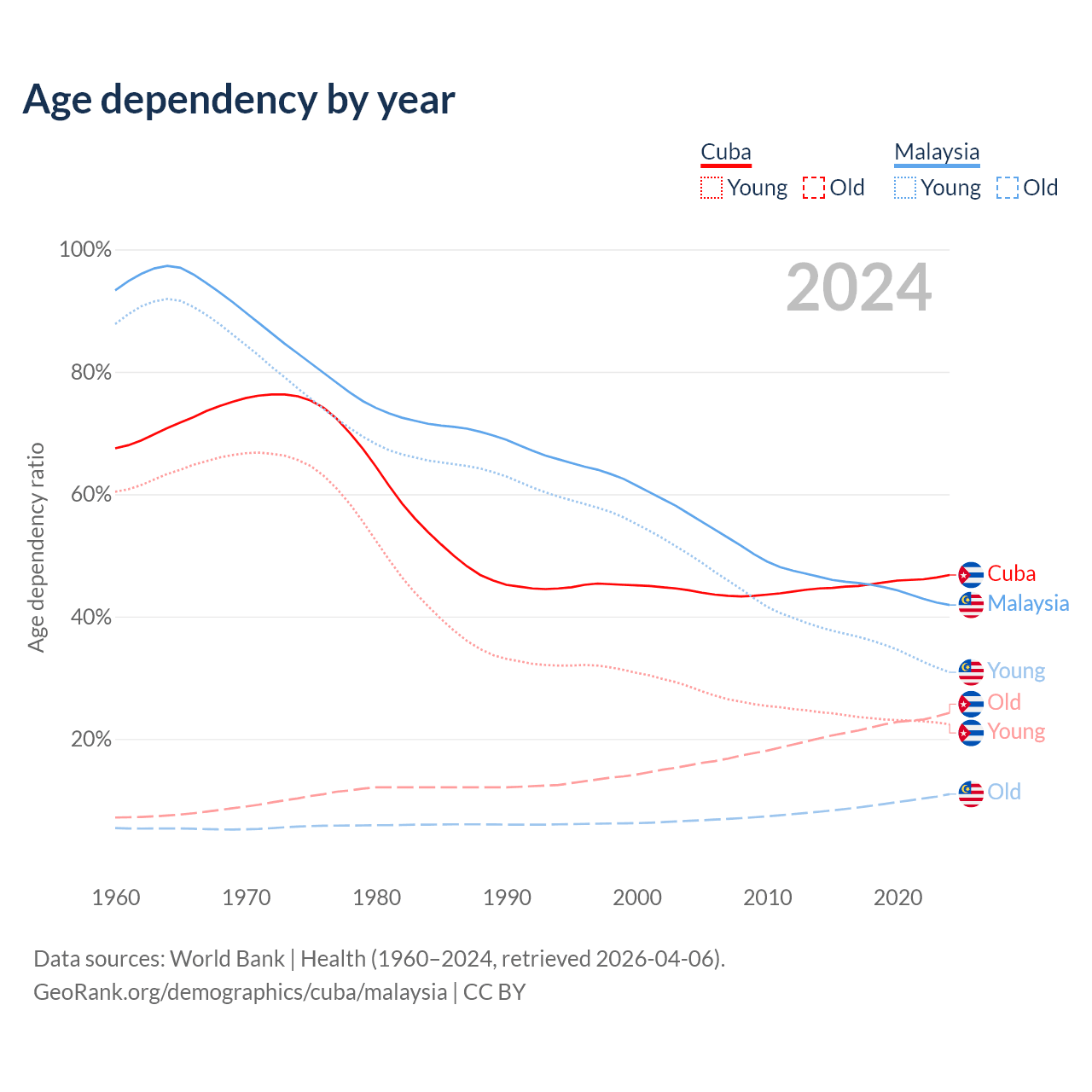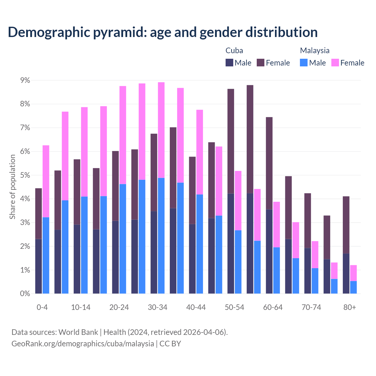 - Cuba is ranked 27/196 by median age (oldest to youngest) vs 92/196 for Malaysia.