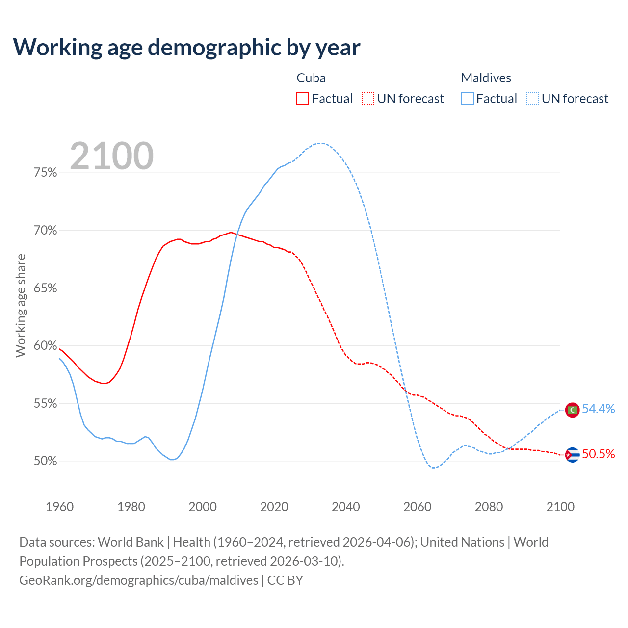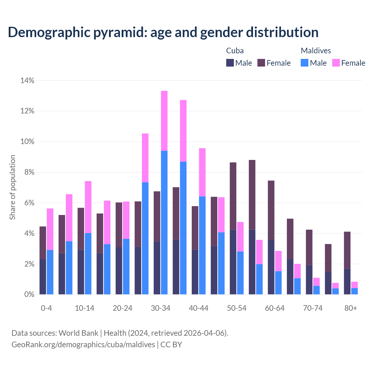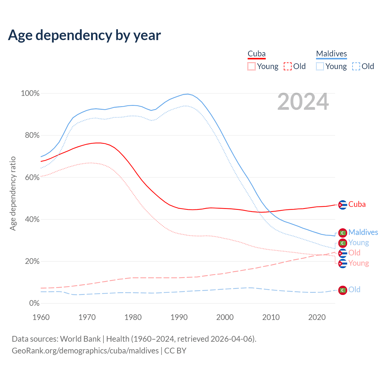 - The share of old-age demographic (65+) in Cuba is 16.6% vs 4.64% in Maldives.