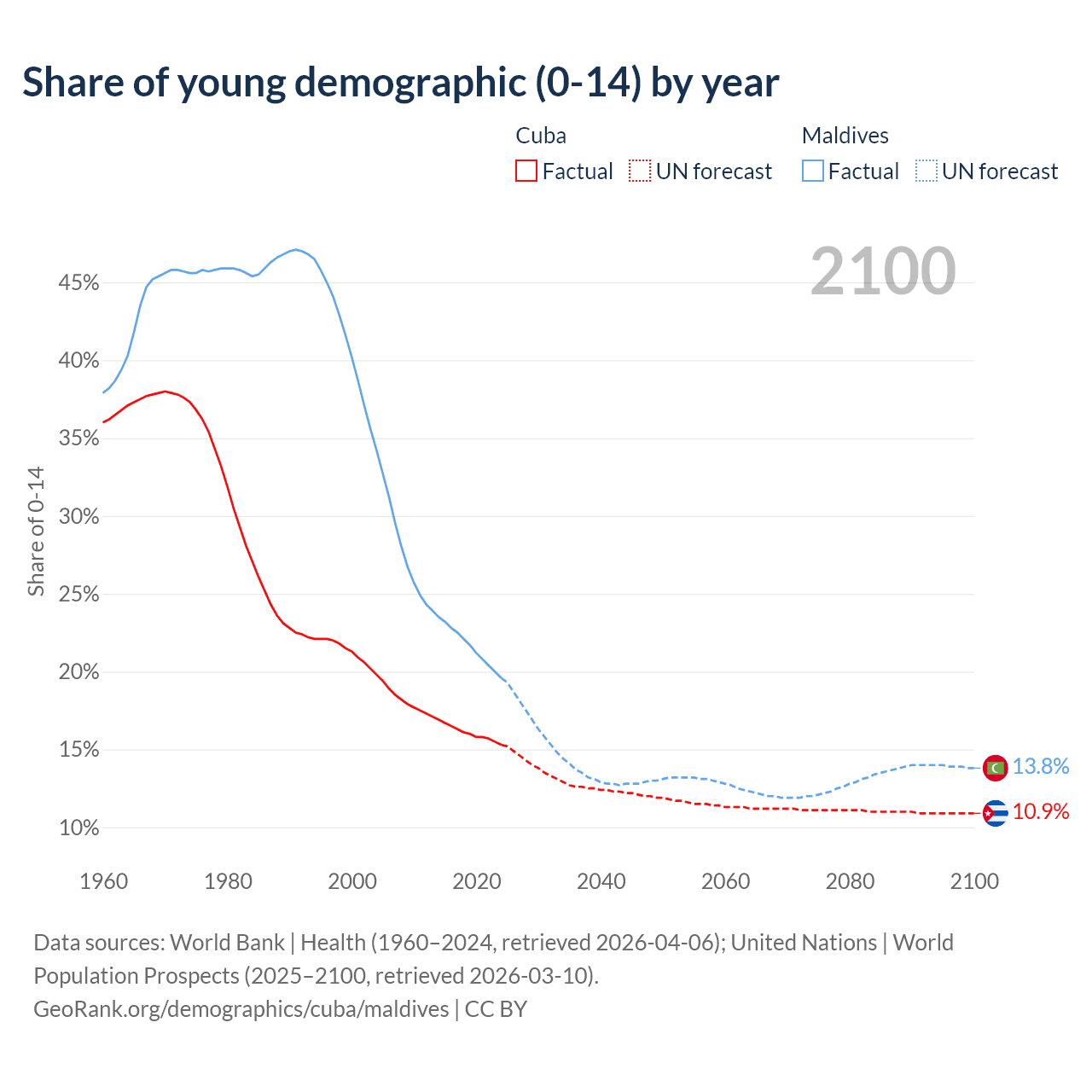 - The share of young demographic (0-15 years old) in Cuba is 15.3% vs 19.6% in Maldives.