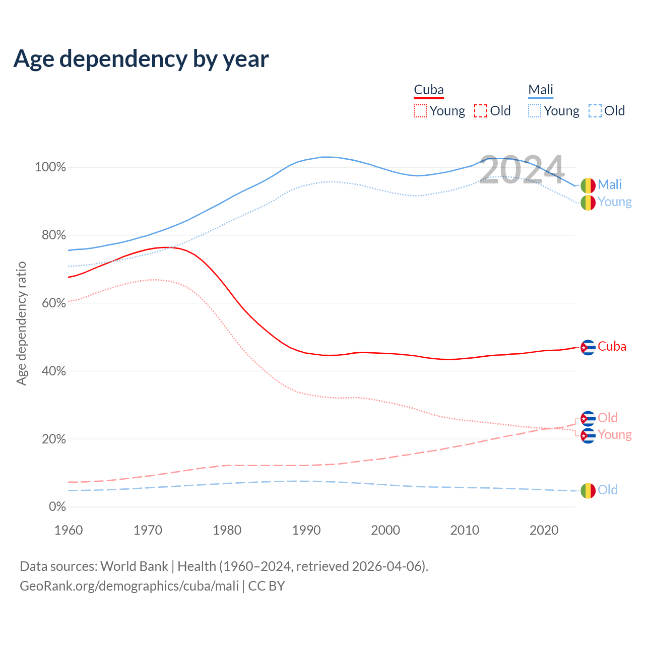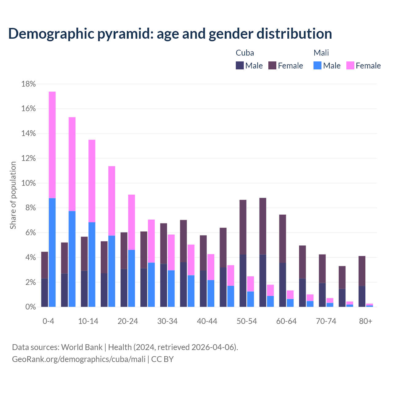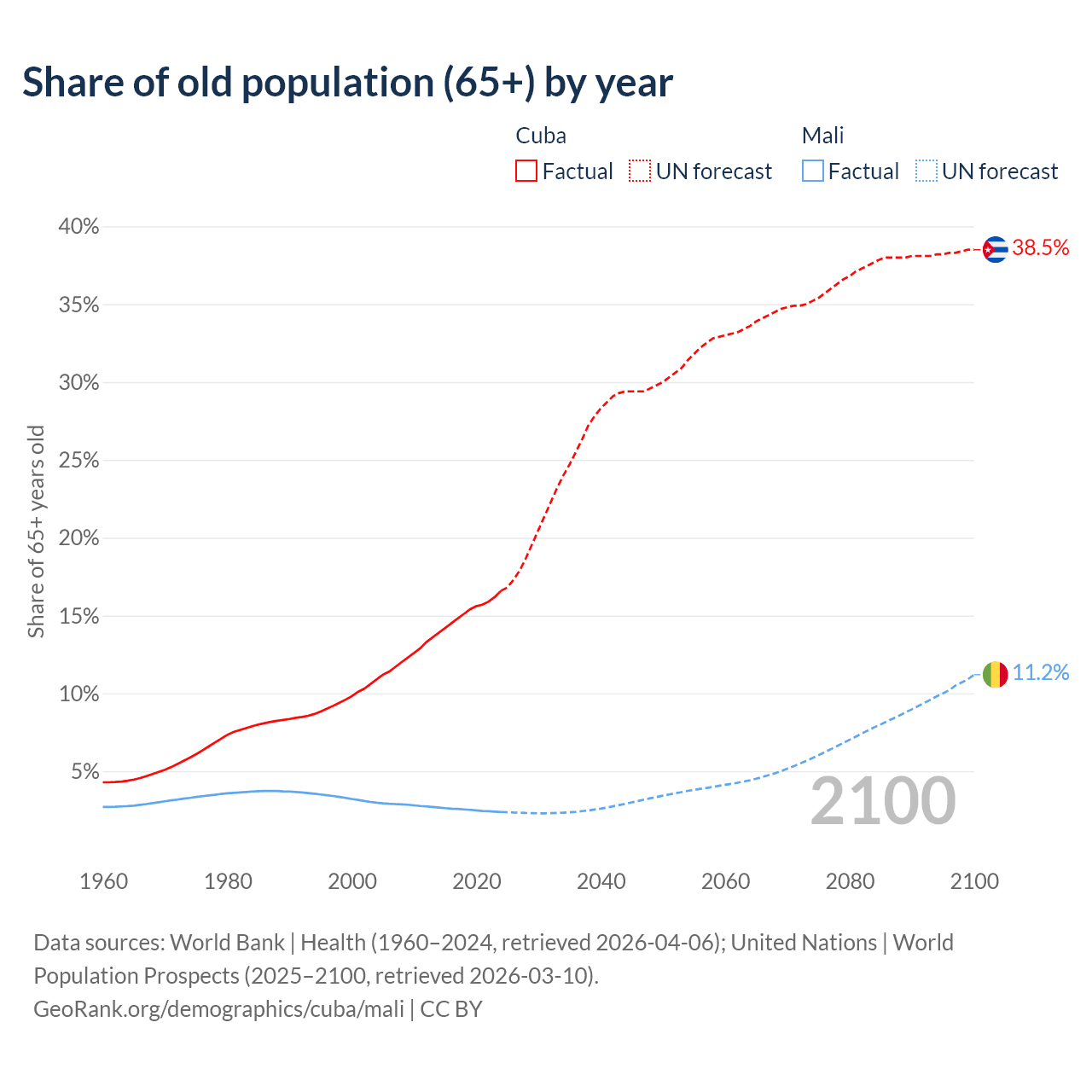 - The share of old-age demographic (65+) in Cuba is 16.6% vs 2.38% in Mali.