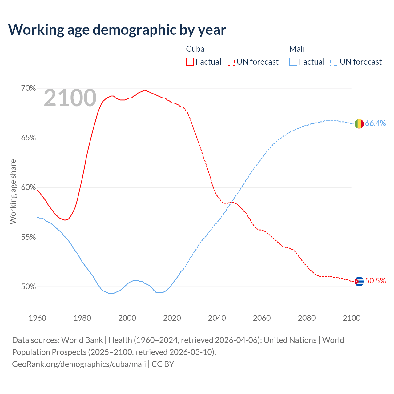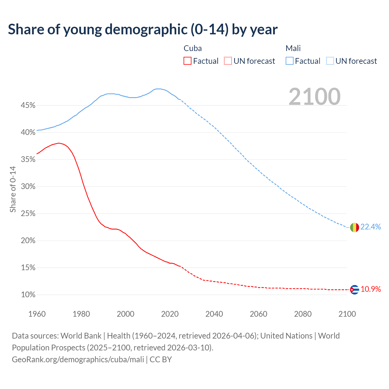 - The share of young demographic (0-15 years old) in Cuba is 15.3% vs 46.1% in Mali.