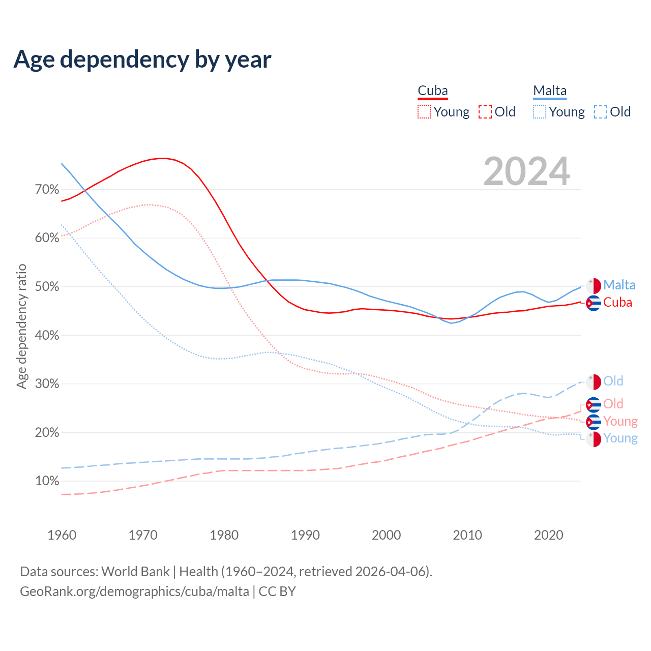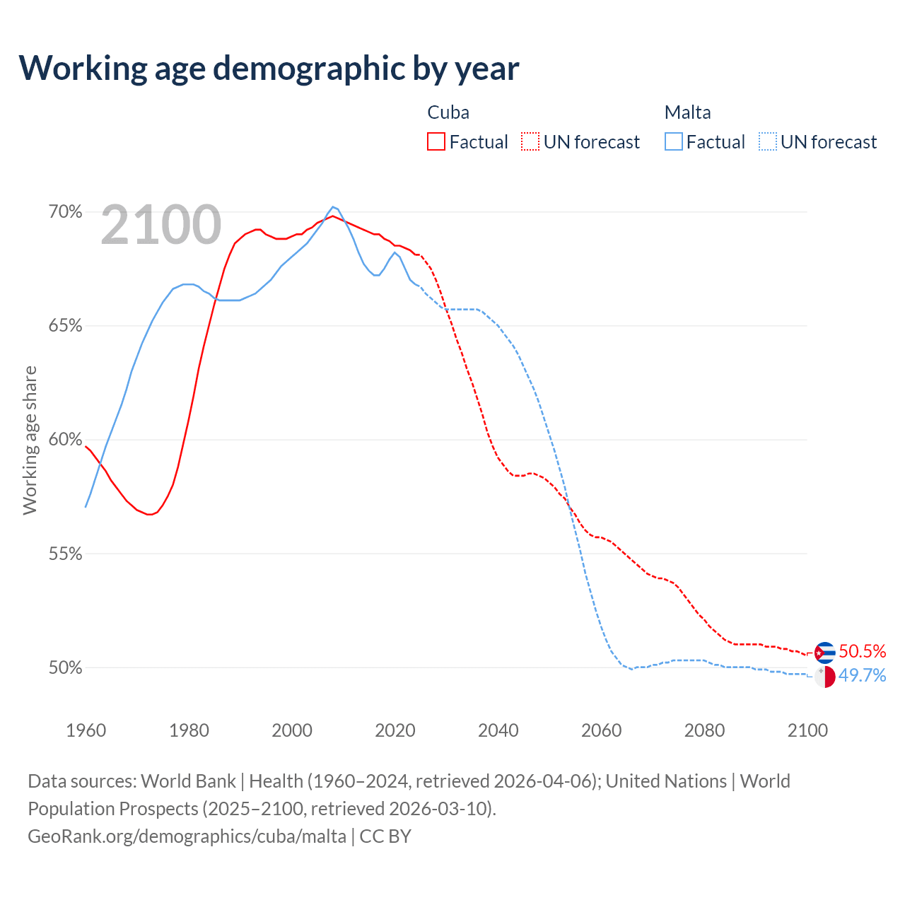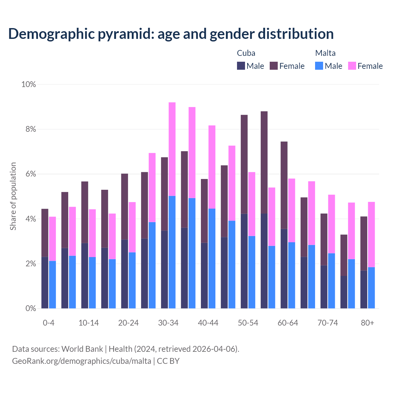 - The share of old-age demographic (65+) in Cuba is 16.6% vs 20.2% in Malta.