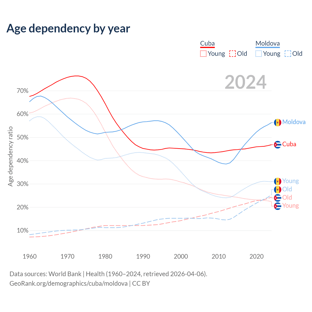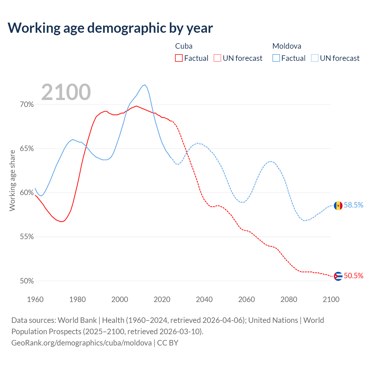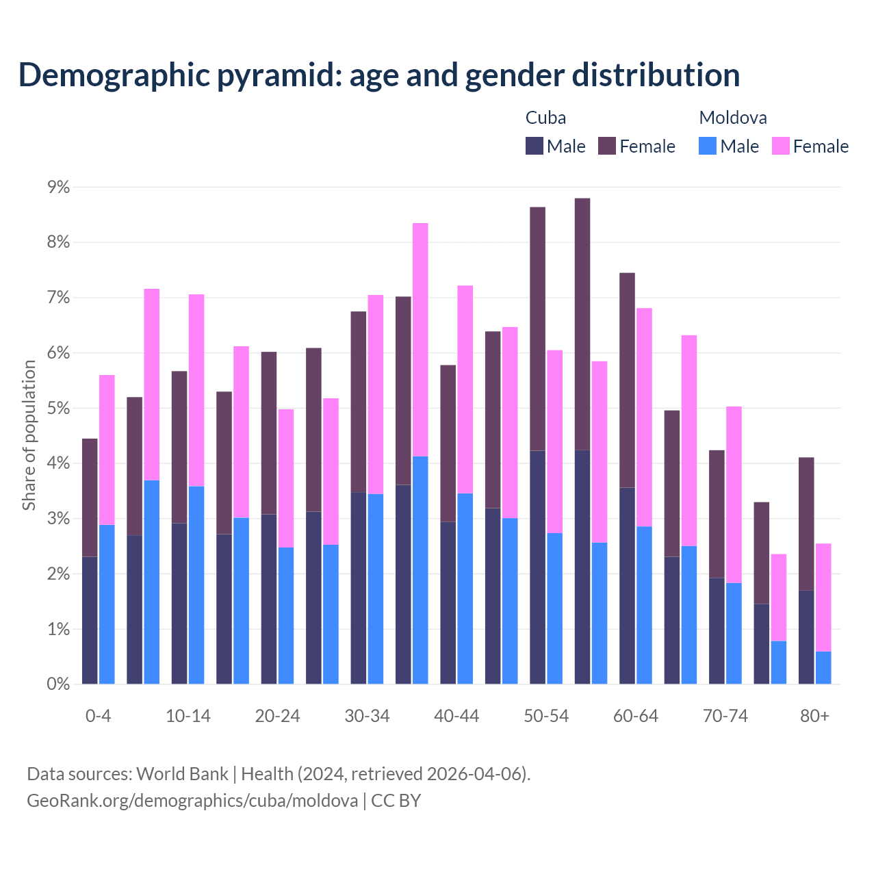 - The share of old-age demographic (65+) in Cuba is 16.6% vs 16.2% in Moldova.
