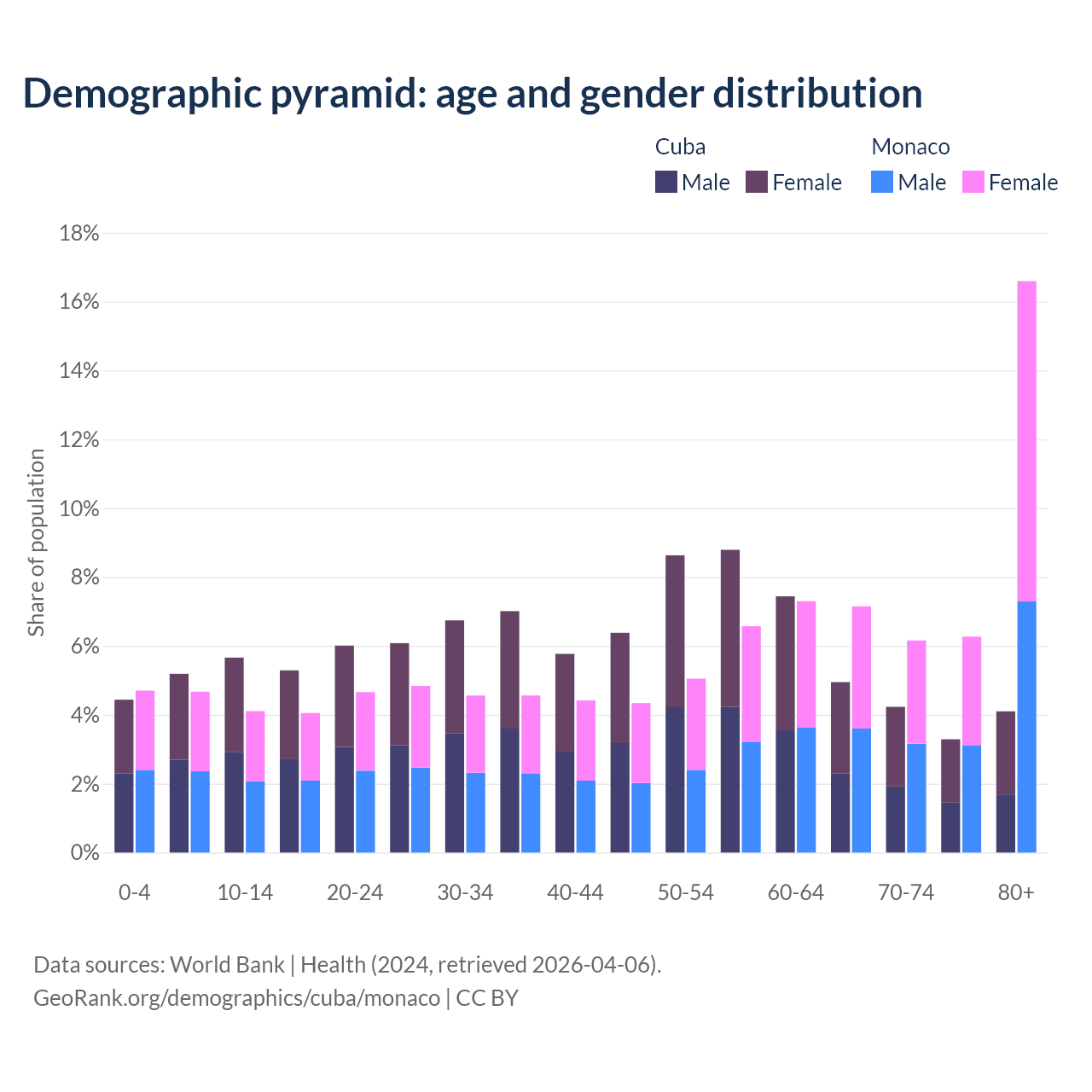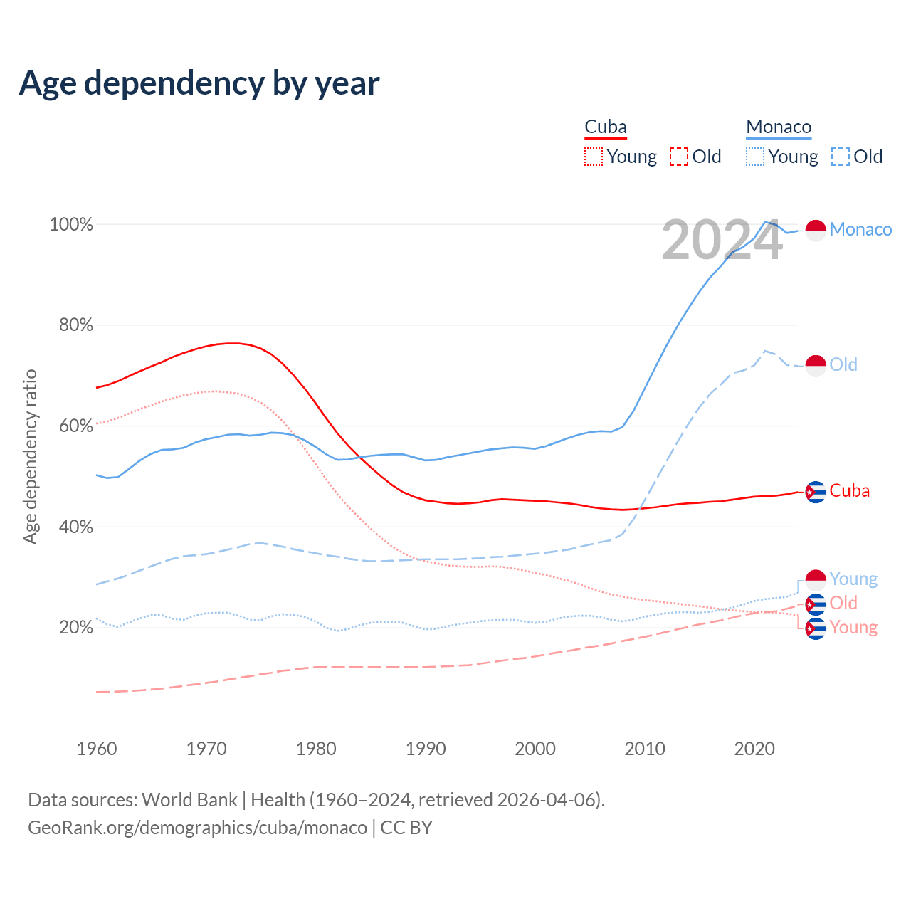 - Cuba is ranked 27/196 by median age (oldest to youngest) vs 1/196 for Monaco.