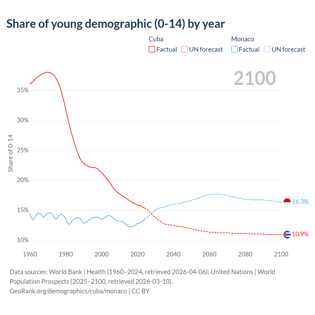 - The share of young demographic (0-15 years old) in Cuba is 15.3% vs 13.5% in Monaco.