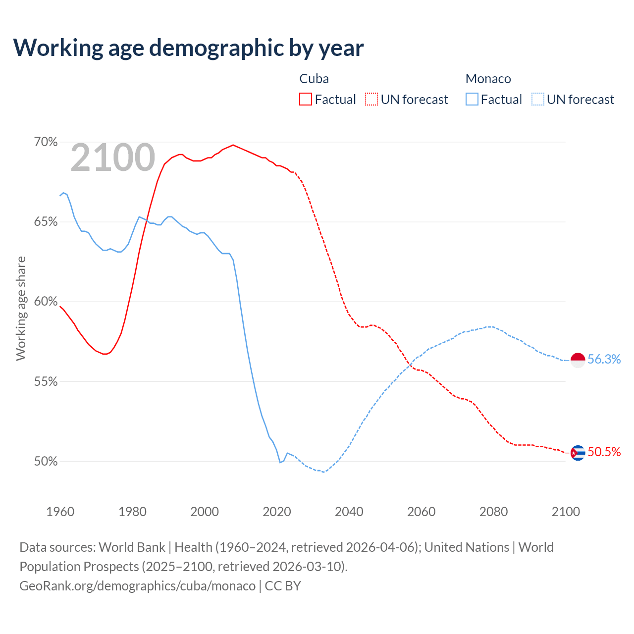 - Cuba has 7.42M working age adults (aged 15-64) vs 19.2K in Monaco.
