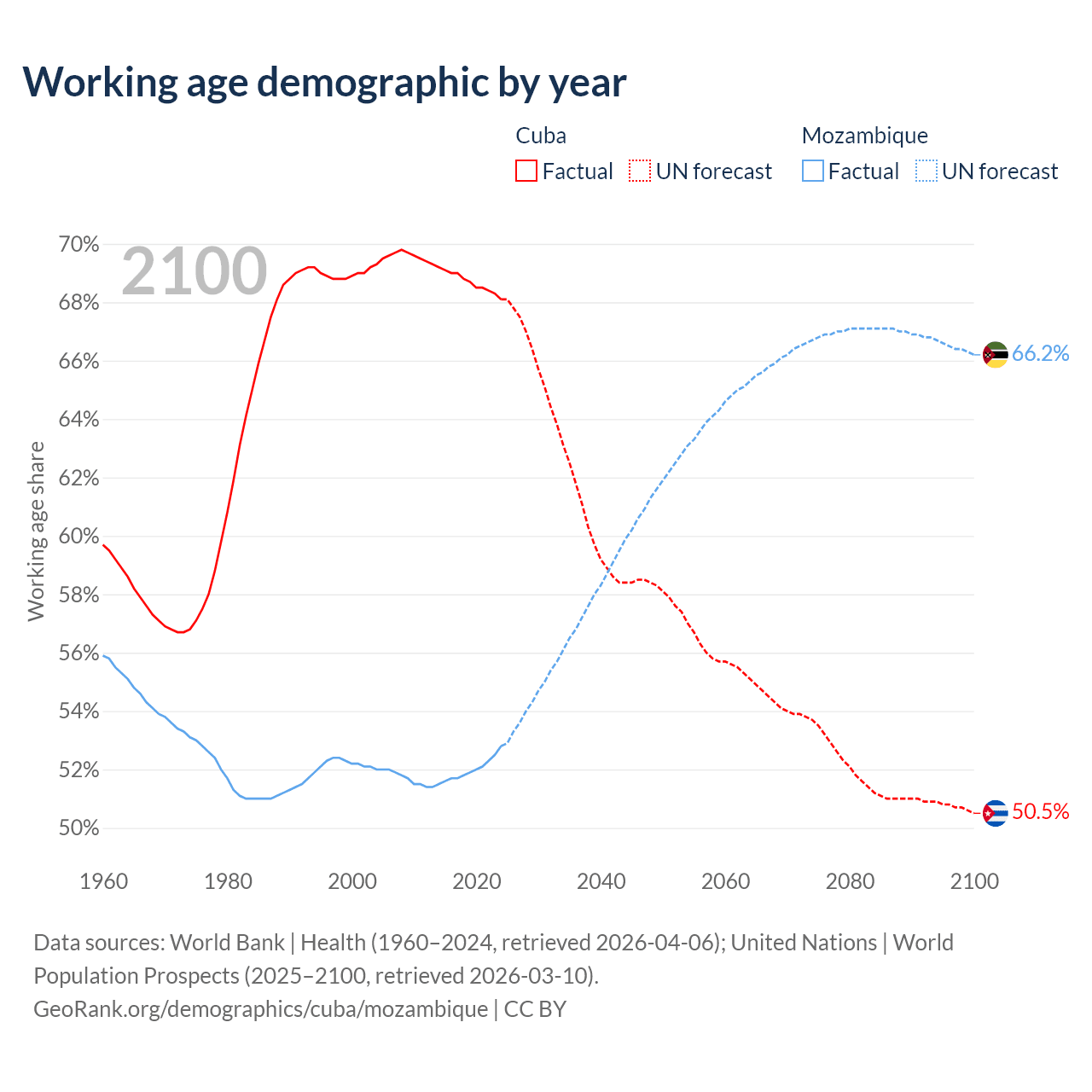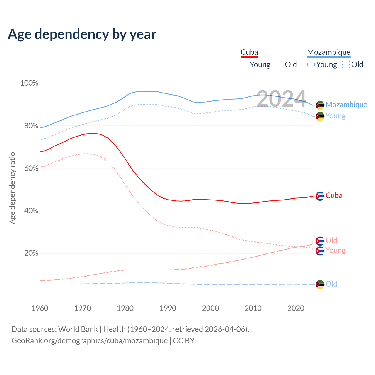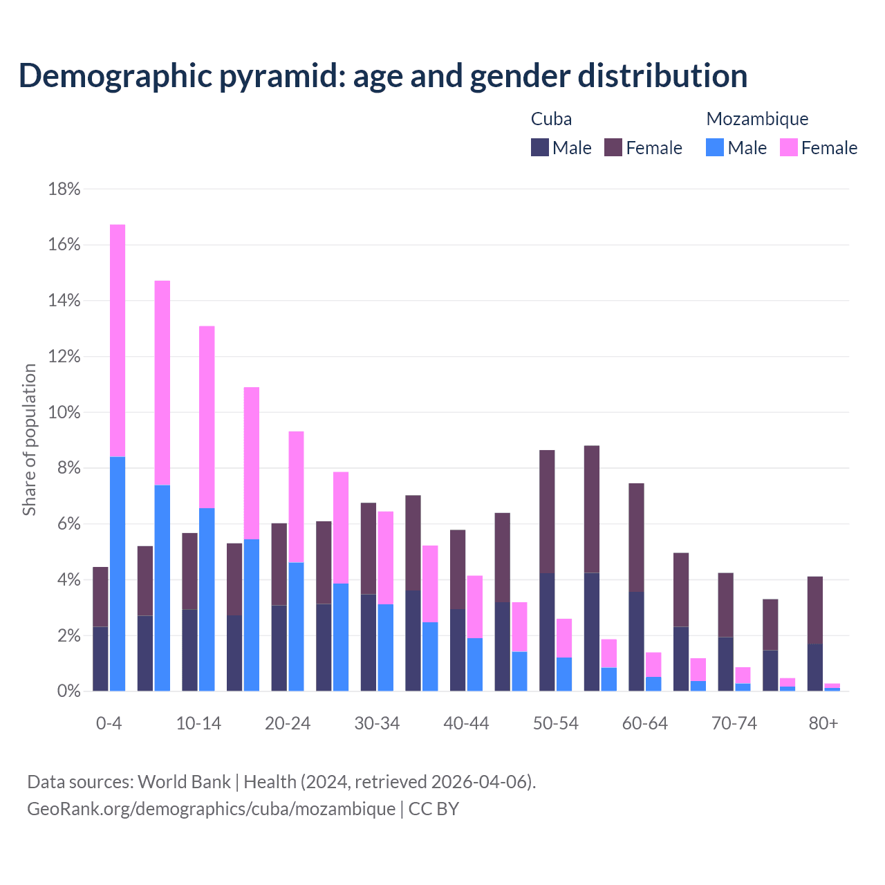 - The share of old-age demographic (65+) in Cuba is 16.6% vs 2.75% in Mozambique.