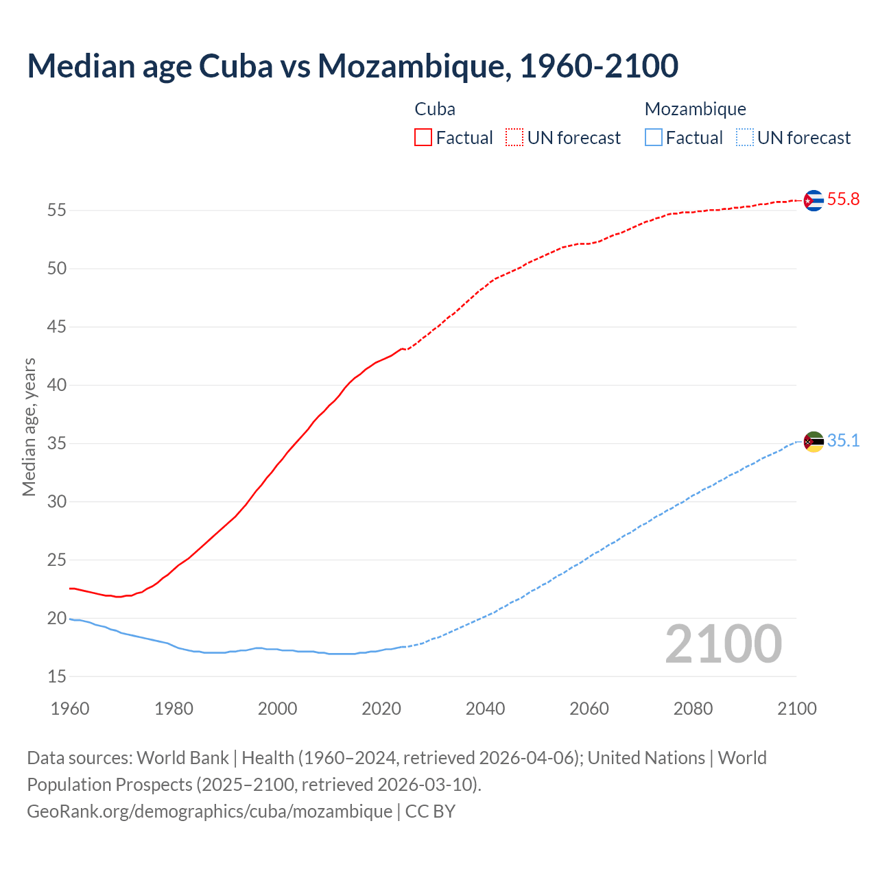 Median age Cuba vs Mozambique, 1960-2100