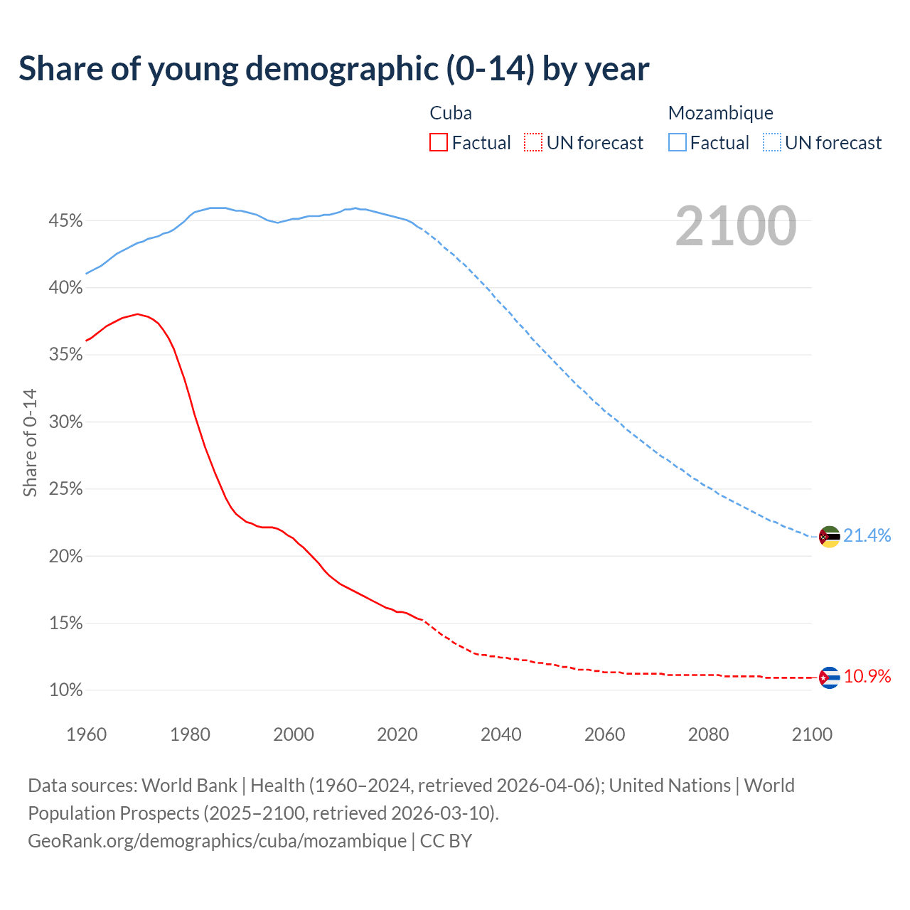 - The share of young demographic (0-15 years old) in Cuba is 15.3% vs 44.5% in Mozambique.
