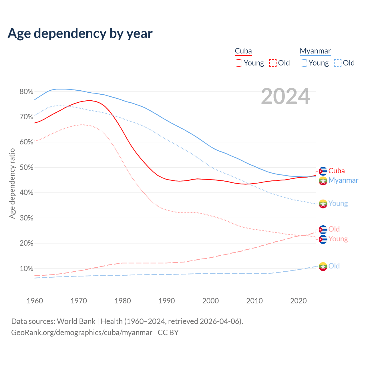 - Cuba is ranked 27/196 by median age (oldest to youngest) vs 96/196 for Myanmar.