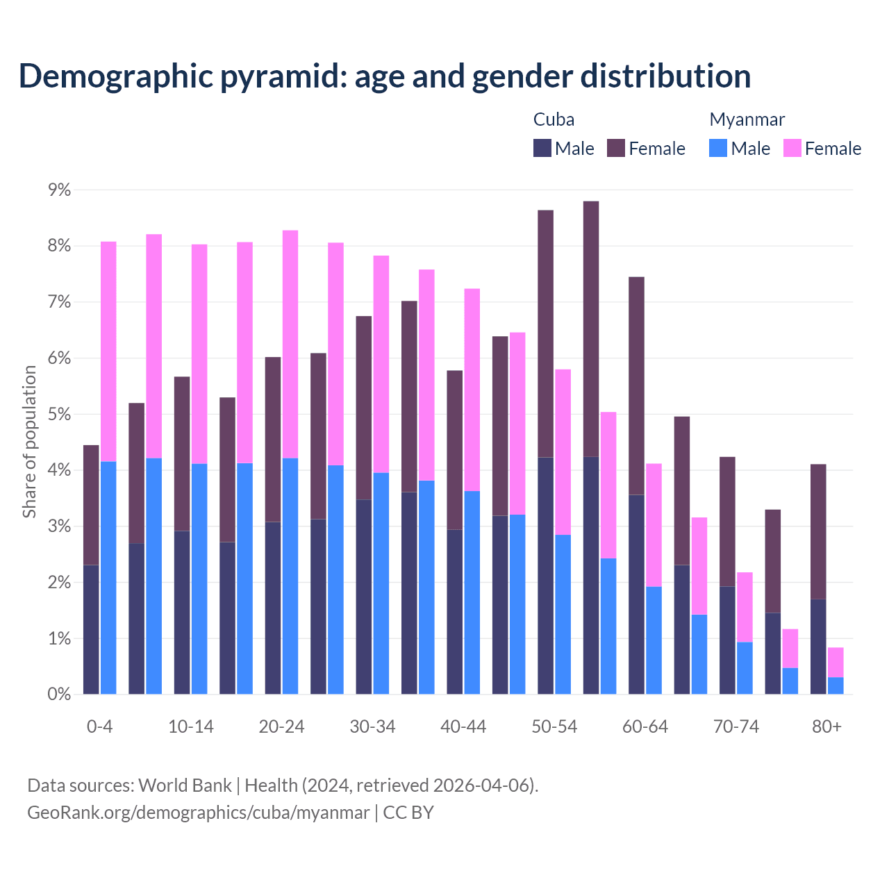 The share of older people aged 65 and over is 16.6% in Cuba and 7.3% in Myanmar. Life expectancy in Cuba compared to Myanmar .