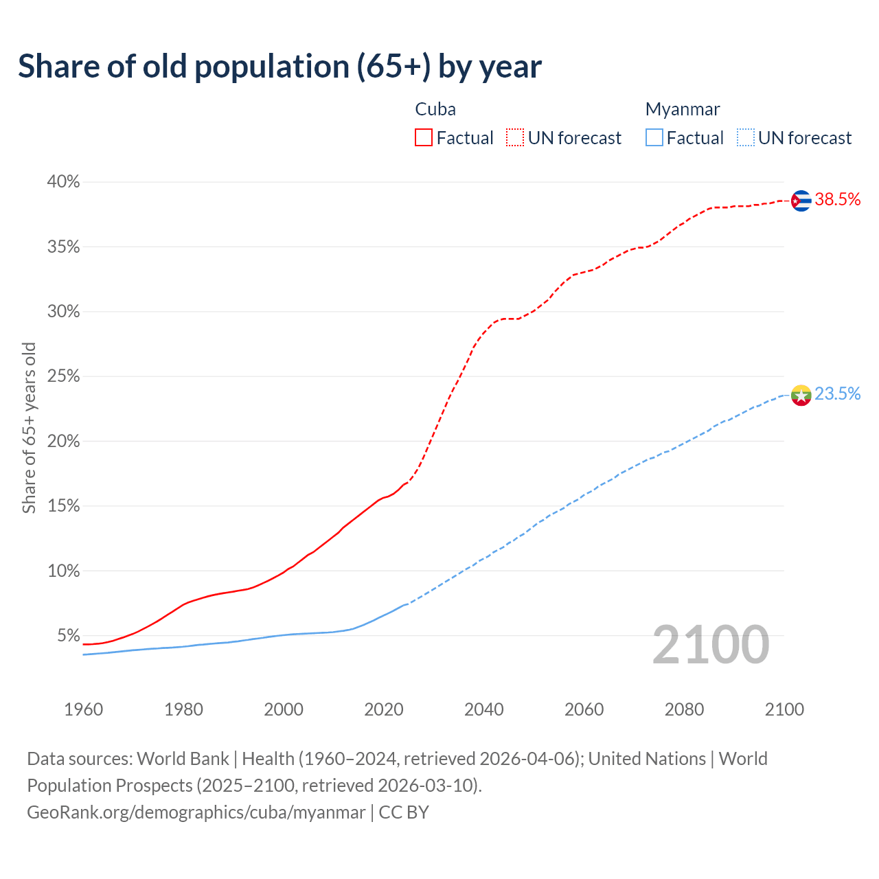 - The share of old-age demographic (65+) in Cuba is 16.6% vs 7.3% in Myanmar.