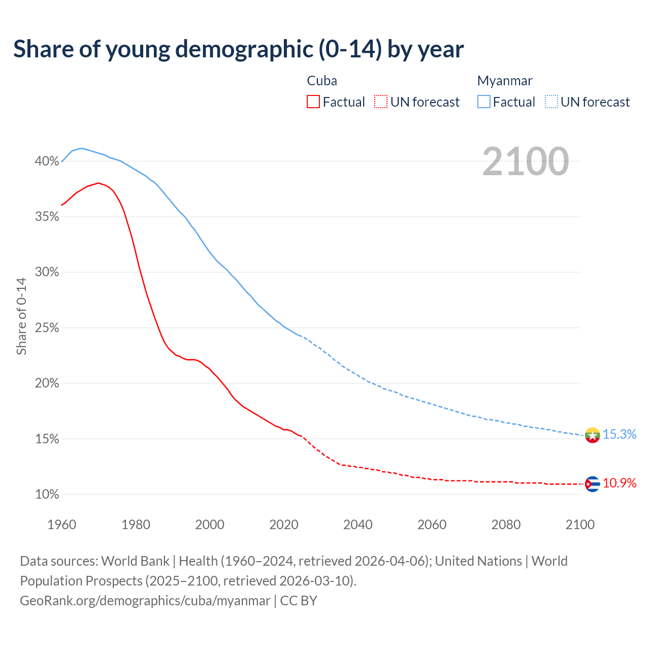 - The share of young demographic (0-15 years old) in Cuba is 15.3% vs 24.3% in Myanmar.