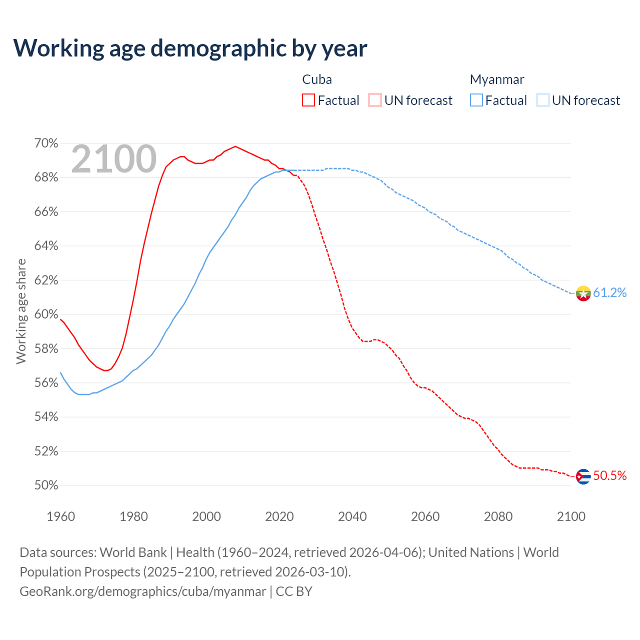 Median age Cuba vs Myanmar, 1960-2100