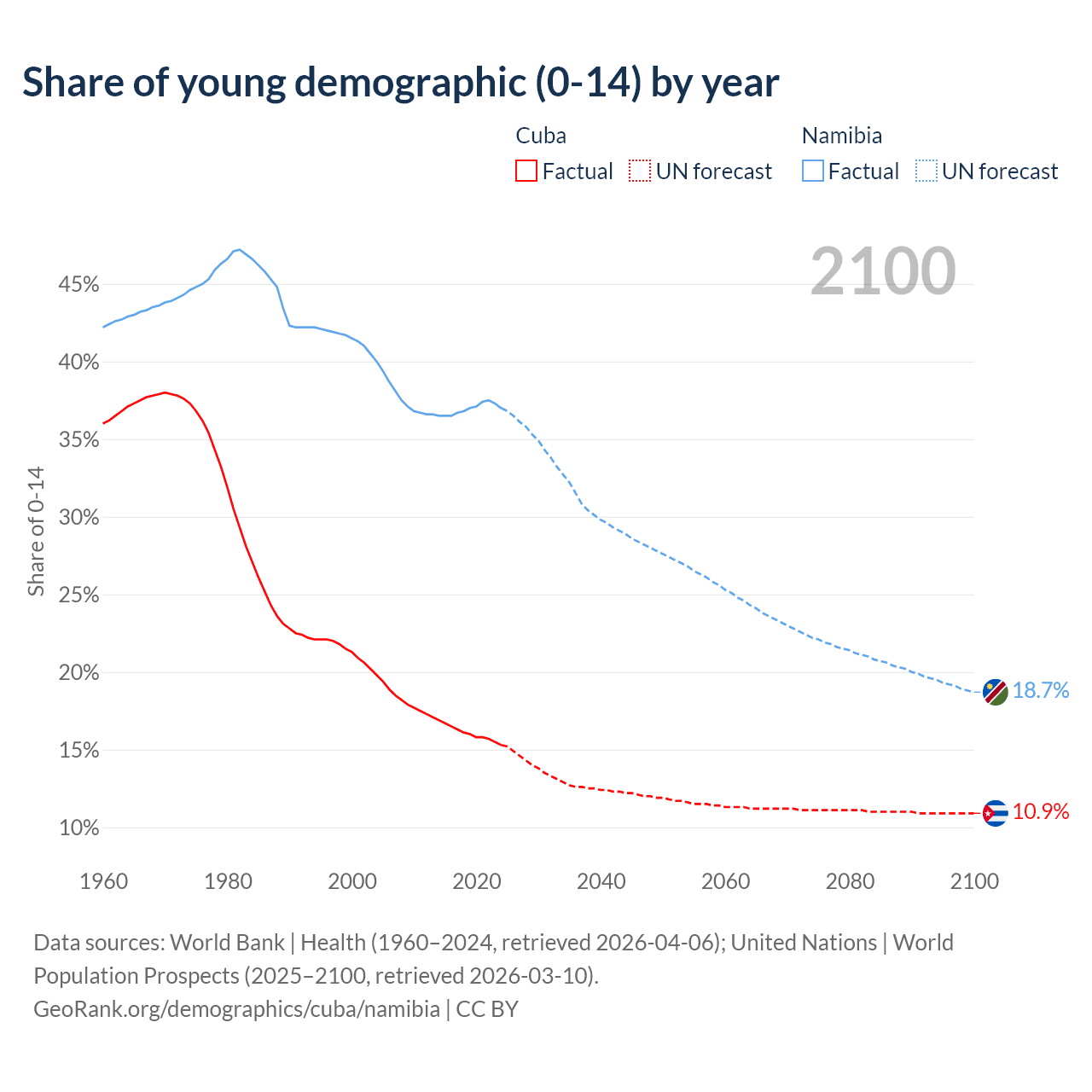 - Cuba is ranked 27/196 by median age (oldest to youngest) vs 147/196 for Namibia.