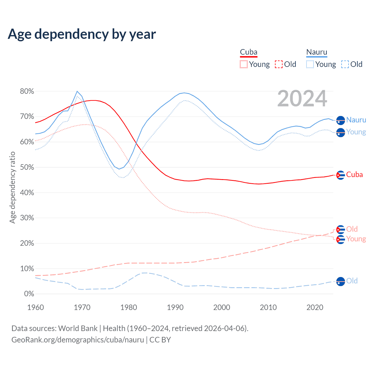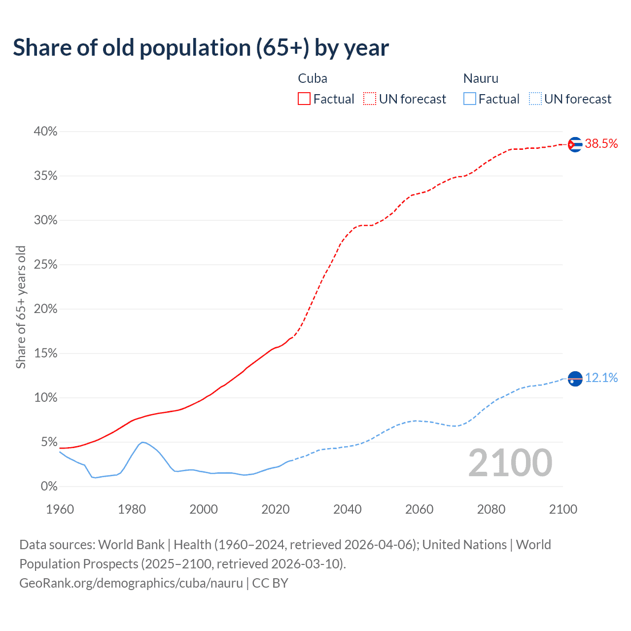 The share of older people aged 65 and over is 16.6% in Cuba and 2.85% in Nauru. Life expectancy in Cuba compared to Nauru .