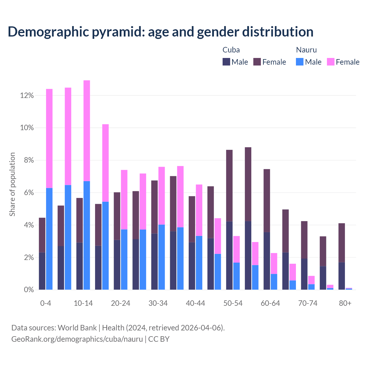 - As of 2026, the population of Cuba is 10.9M vs 12.1K in Nauru - 899 times difference.