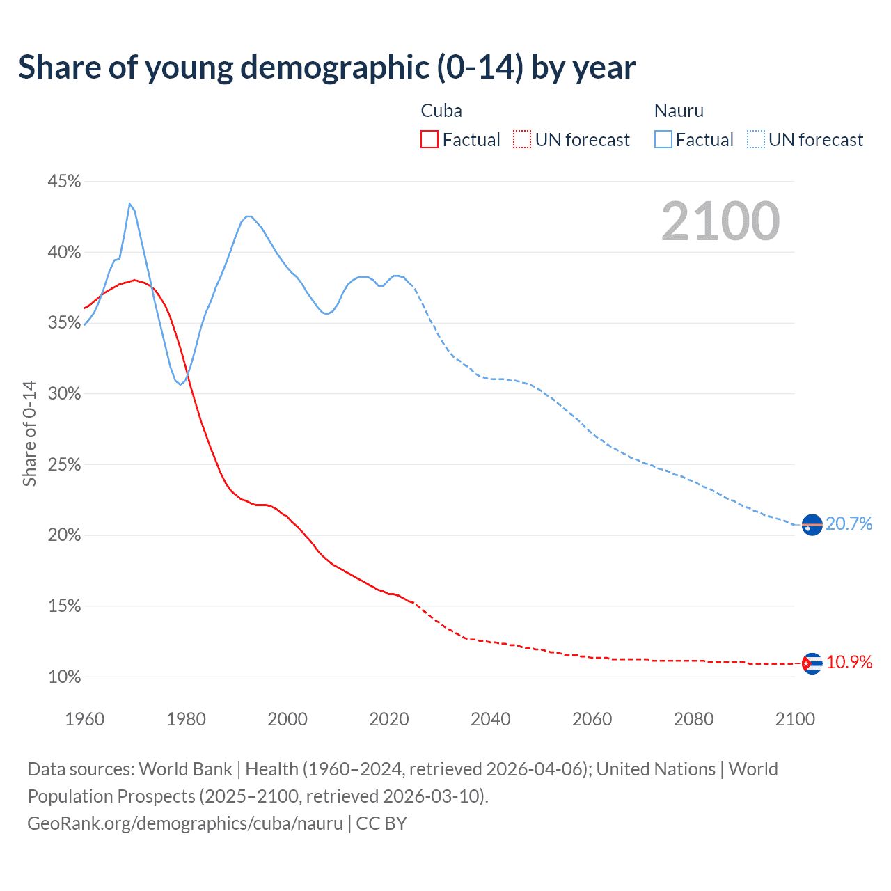 - The share of young demographic (0-15 years old) in Cuba is 15.3% vs 37.8% in Nauru.
